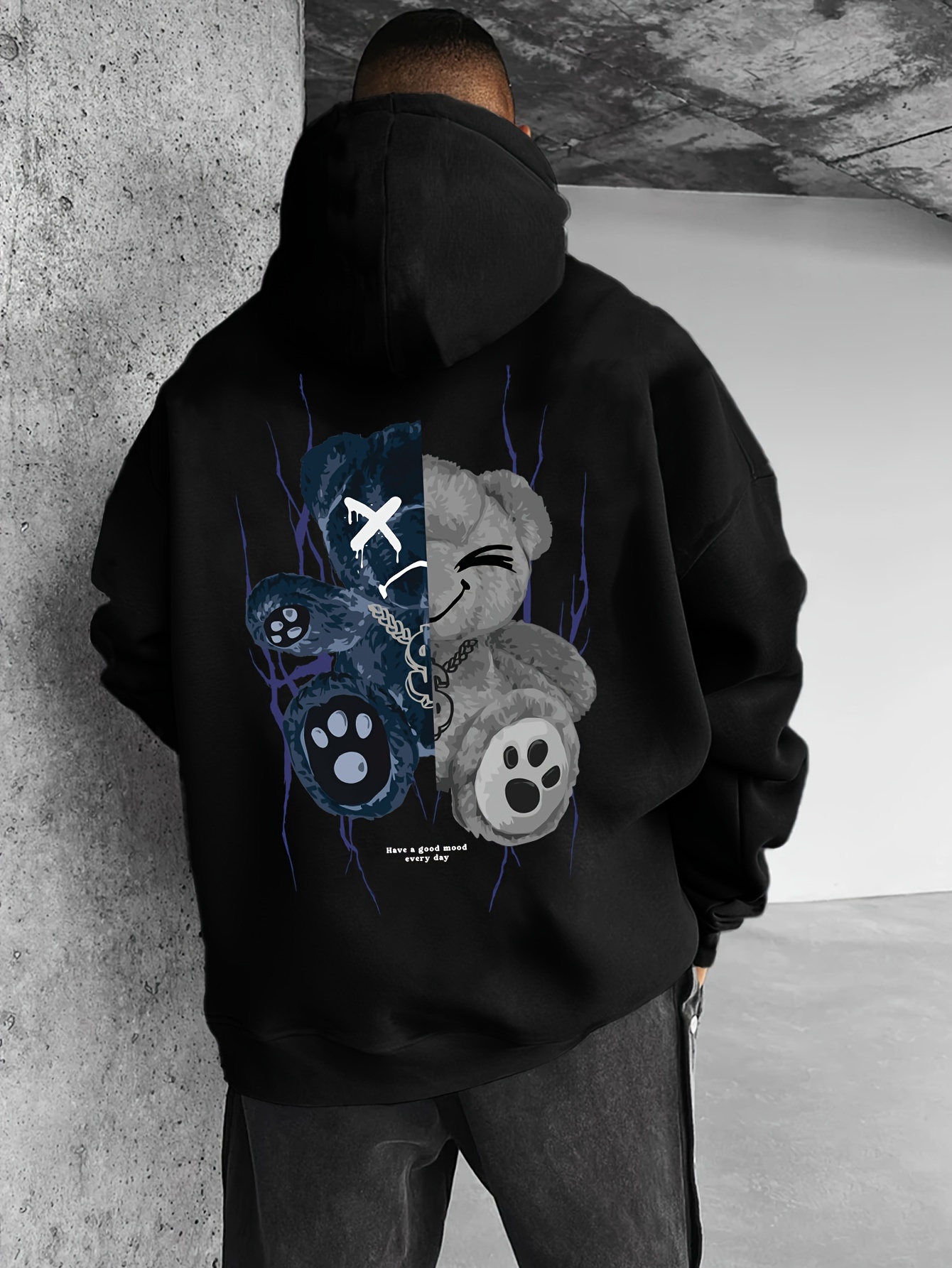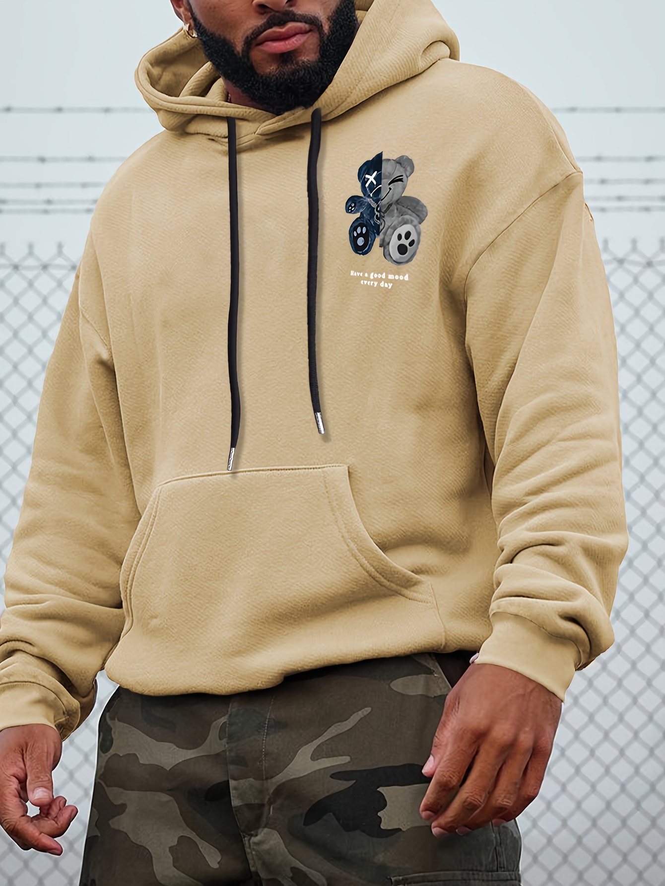 Men's Plus Size Casual Hoodie with Geometric Bear Design - Polyester, Machine Washable, Faux Pocket Detail, PLUS SIZE