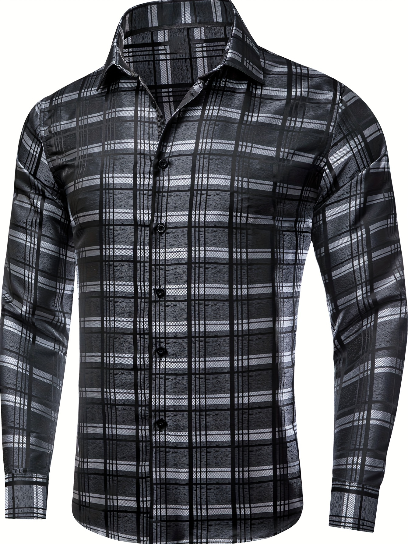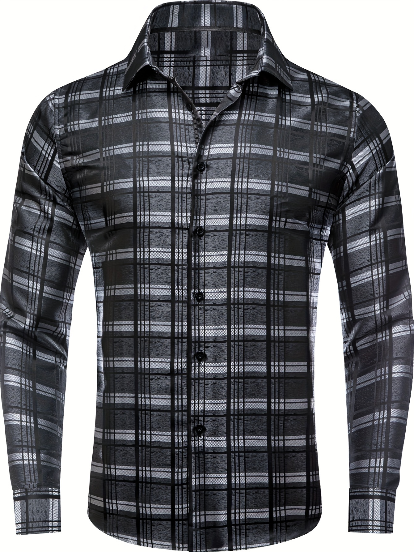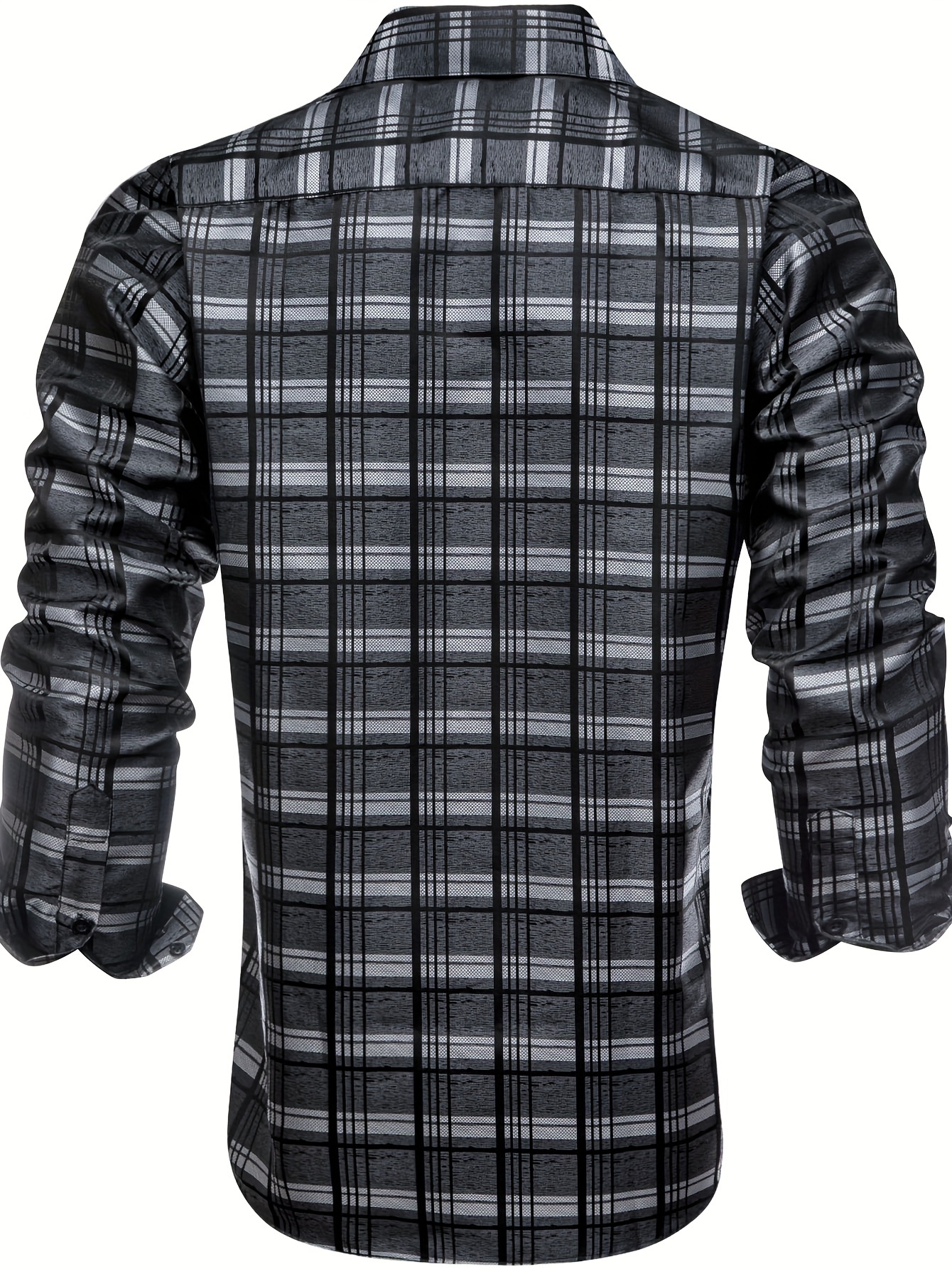 Plus Size Formal Men'S Dress Black Grey Checks Plaids Button Up Dress Shirt, Mature Elegant Top For Wedding/business/dating