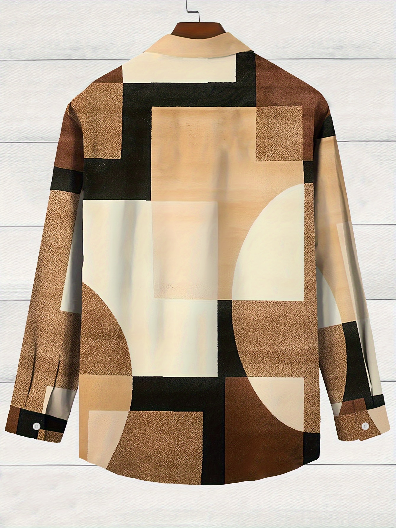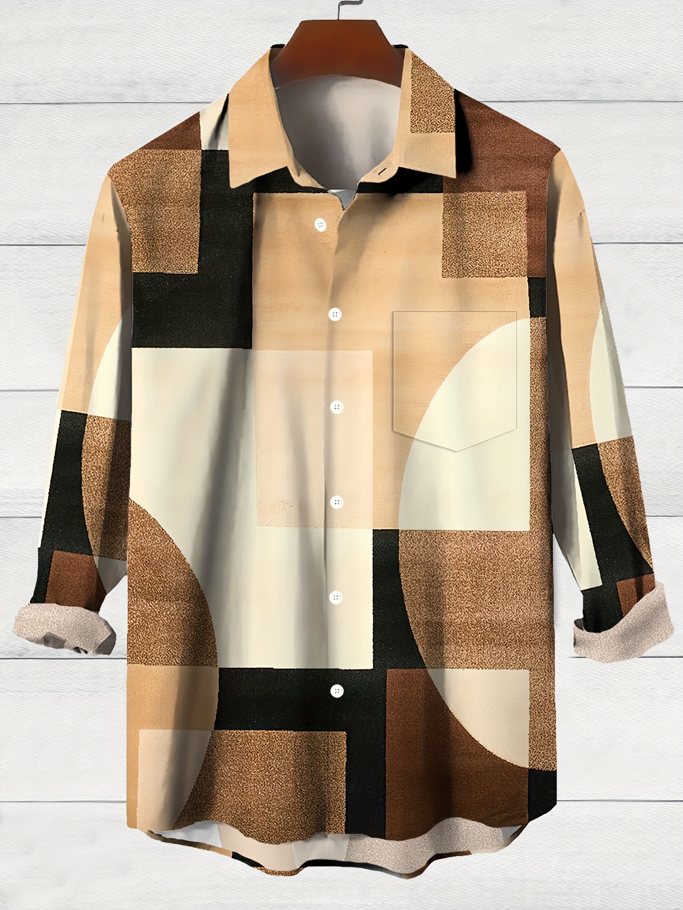 Vintage-Inspired Geometric Color Block 3D Print Men's Plus Size Button-Up Shirt with Pockets - Polyester, Machine Washable, PLUS SIZE