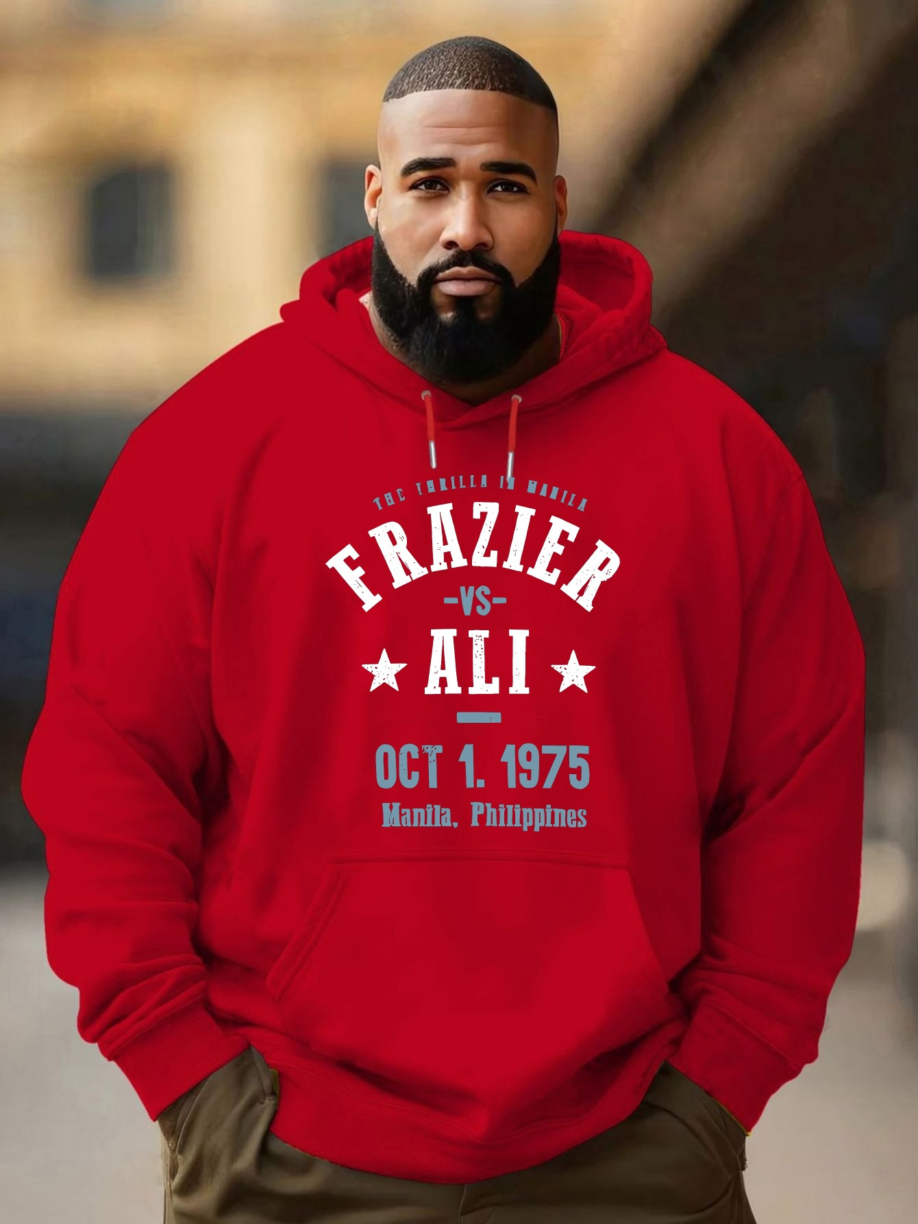 Men'S Plus Size Hoodie, Frazier vs Ali 1975 Print, Polyester Microfiber, Casual Sports Sweatshirt with Drawstring, Regular Fit, Knit Fabric, Autumn & Winter Fashion