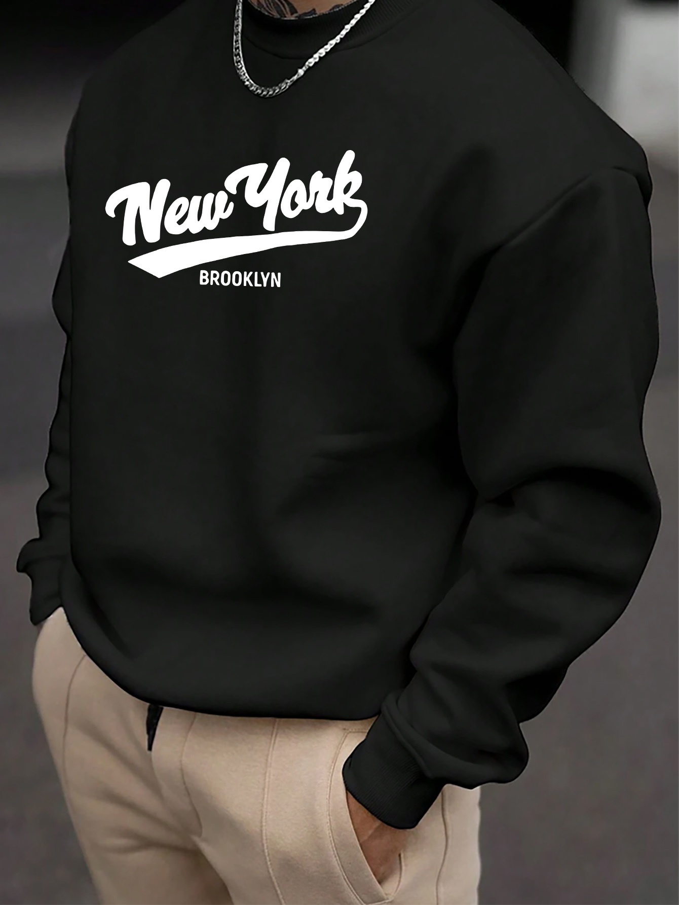 1pc New York Brooklyn Casual Crew Neck Pullover - Geometric Pattern Cotton Blend Sweatshirt, Slight Stretch Knit Fabric, Regular Fit Long Sleeve Top for Men, Plus Size