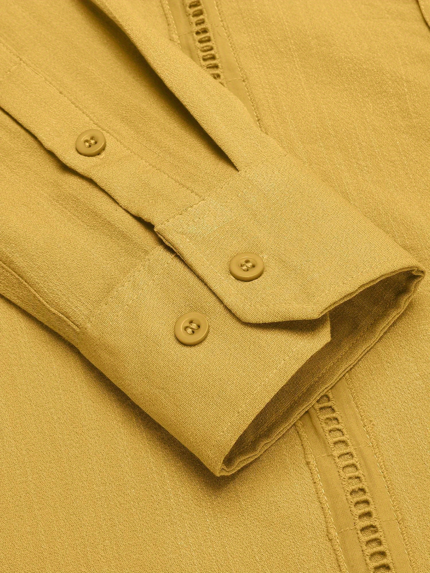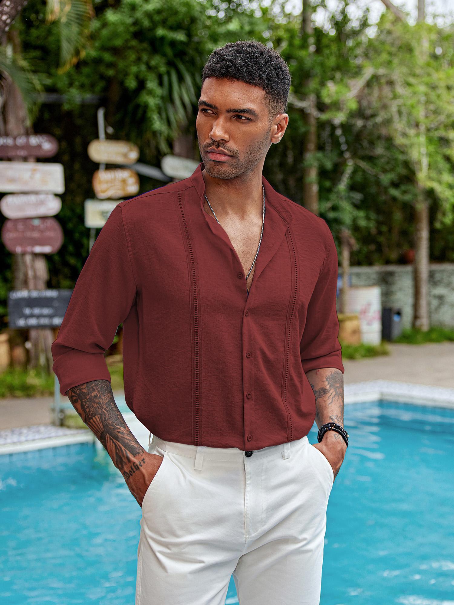 1pc Men'S Casual Crew Neck Long Sleeve Button Down Shirt - Solid Color Rayon/Viscose Blend, Non-Stretch Fabric, Woven Cuban Guayabera Beach Shirt for Spring/Fall, Plus Size