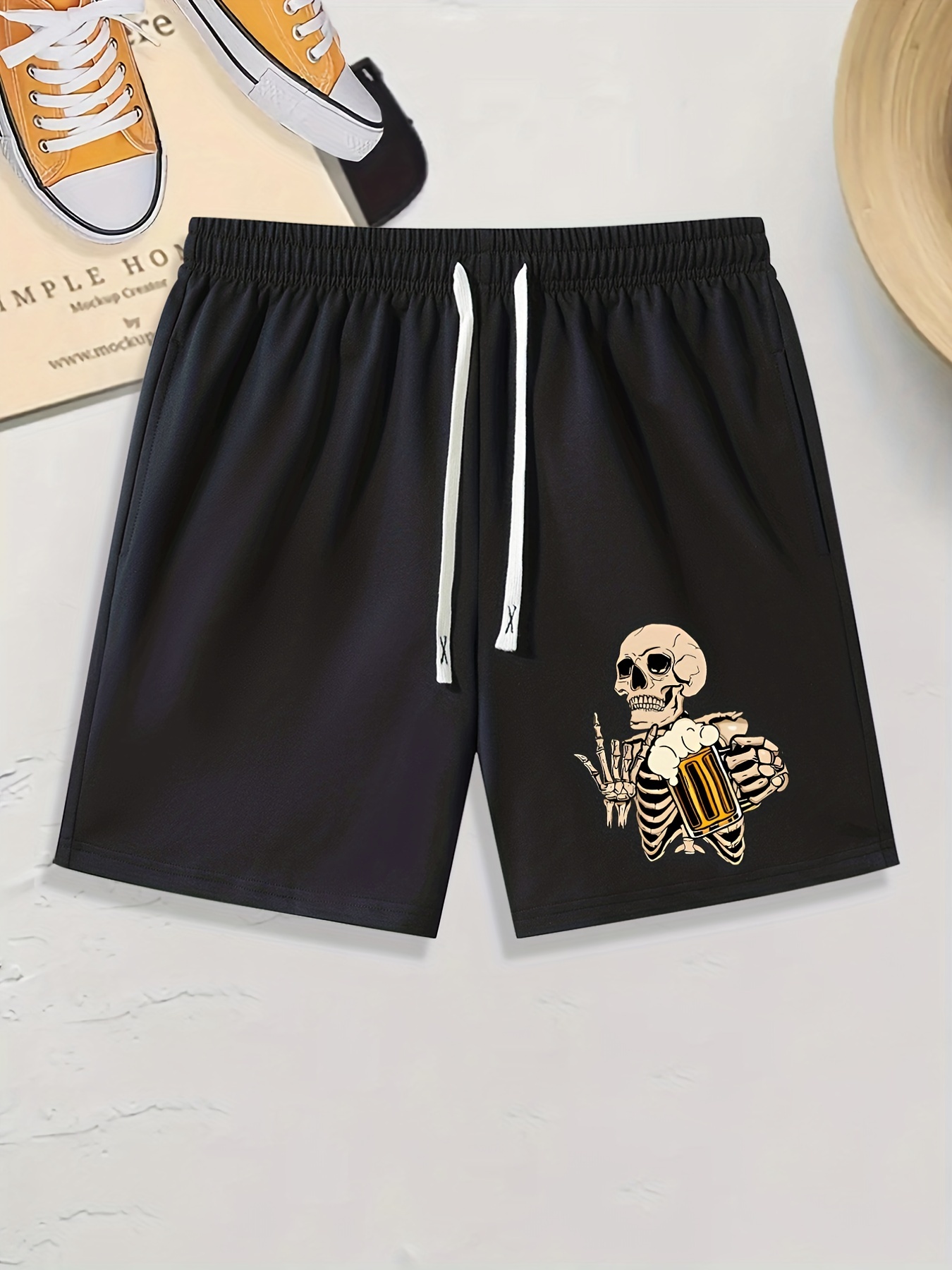 Skeleton With Beer Print, Men’s Comfy Shorts, Summer Drawstring Casual Loose Shorts, Men’s Summer Clothing, As Gifts For Daily Leisure Loungewear Outdoors Halloween