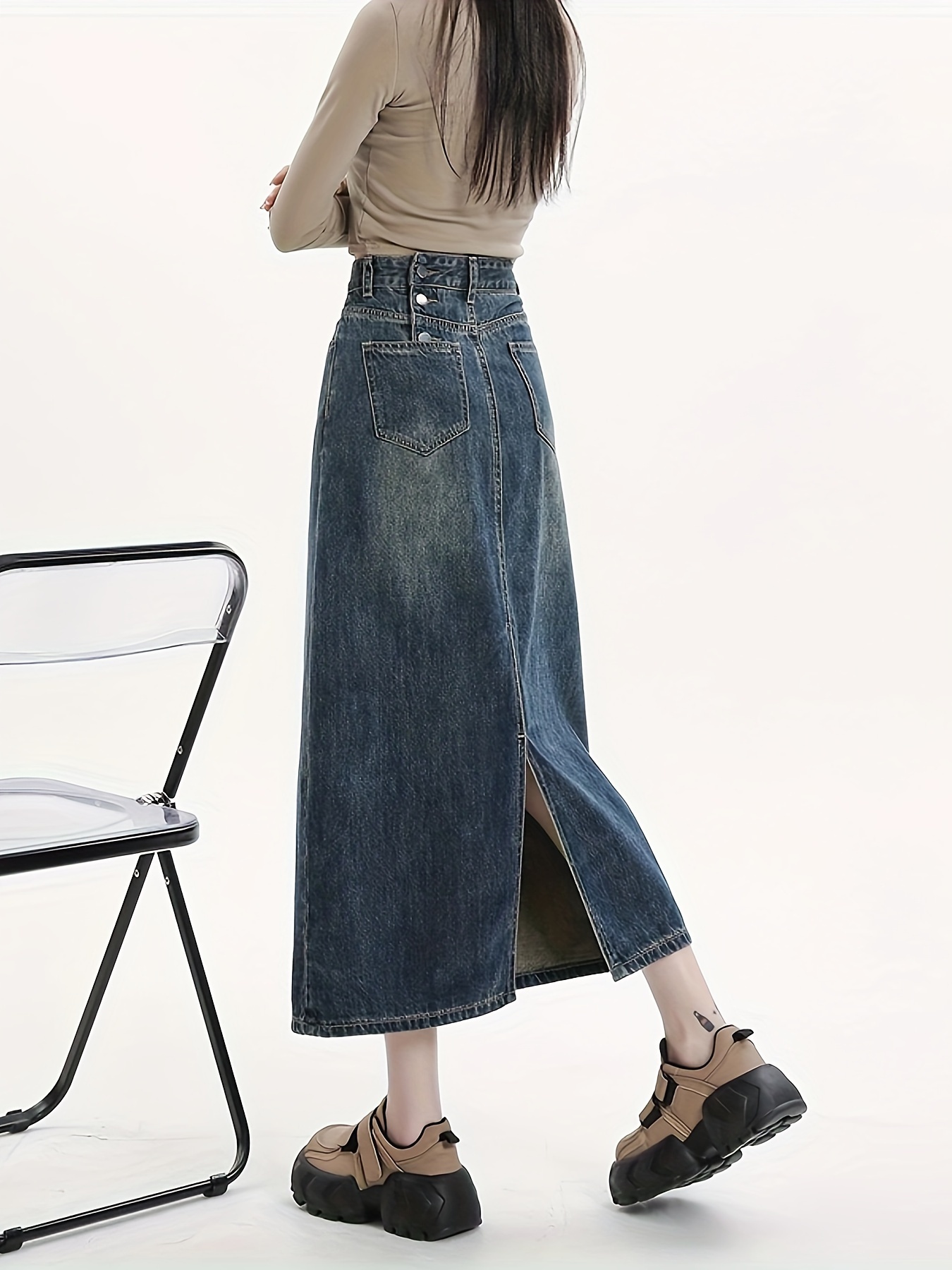 Chic Single-breasted Denim Maxi Skirt – Split Hem, Retro Plain Design – Premium Quality Womens Jeans Clothing for Versatile Style