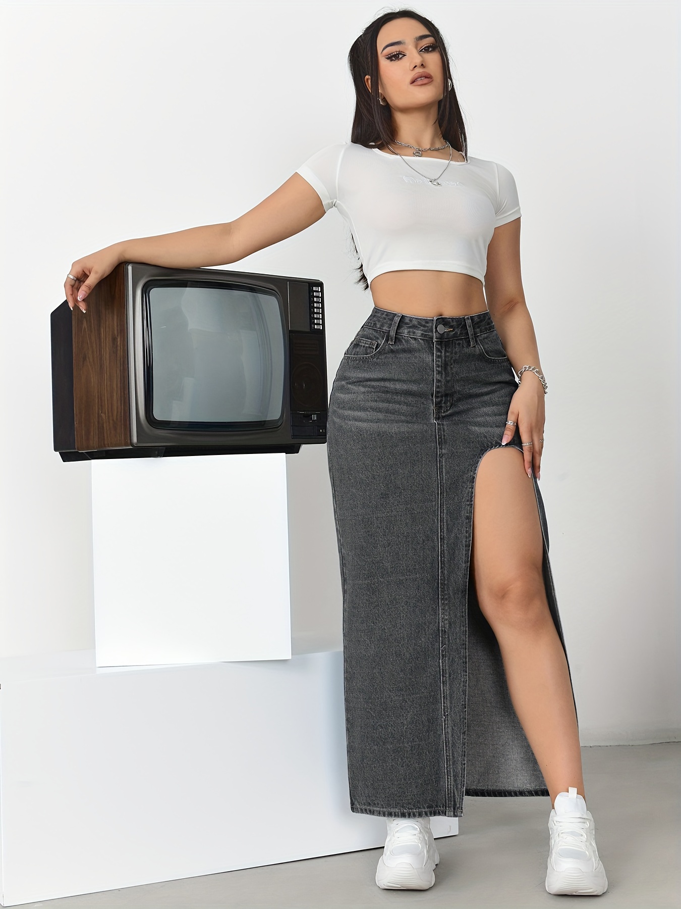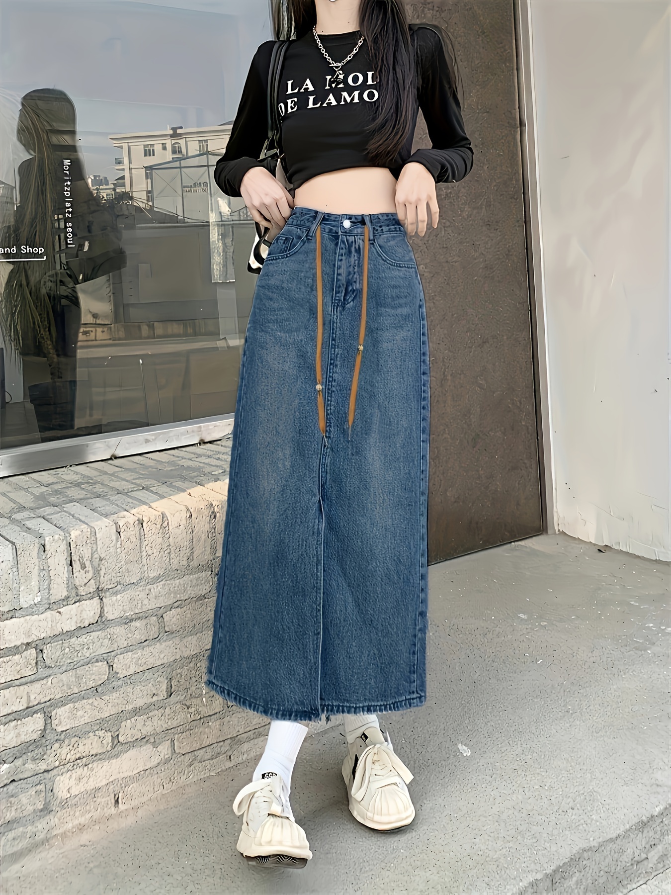 High-Waisted Split Thigh Womens Maxi Denim Skirt – Sexy, Vintage-Inspired, Straight Cut, Non-Stretch Cotton, Solid Color, No Printing, Perfect for Spring, Summer, Fall, Casual Streetwear Fashion