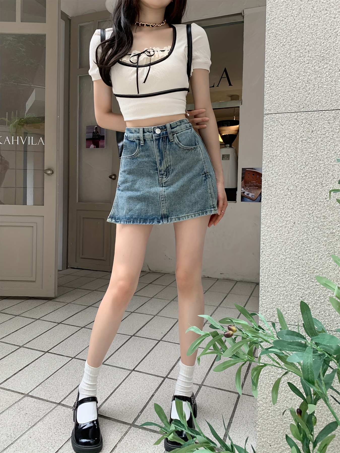 Plain Washed Blue High Rise Retro Style Zipper Button Closure Slash Pocket Mini Denim Skirt, Women’s Denim Jeans & Clothing