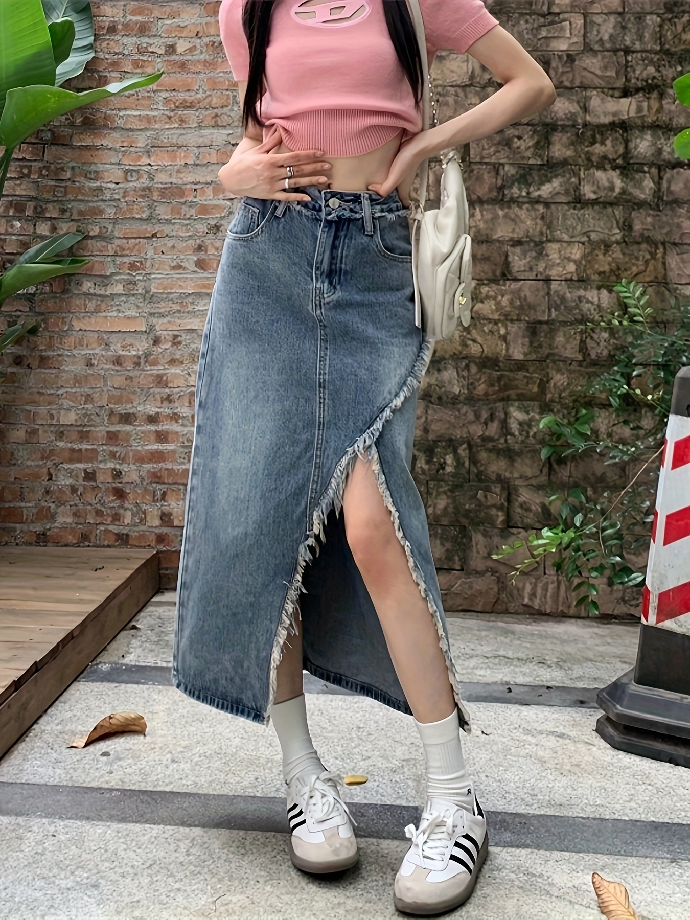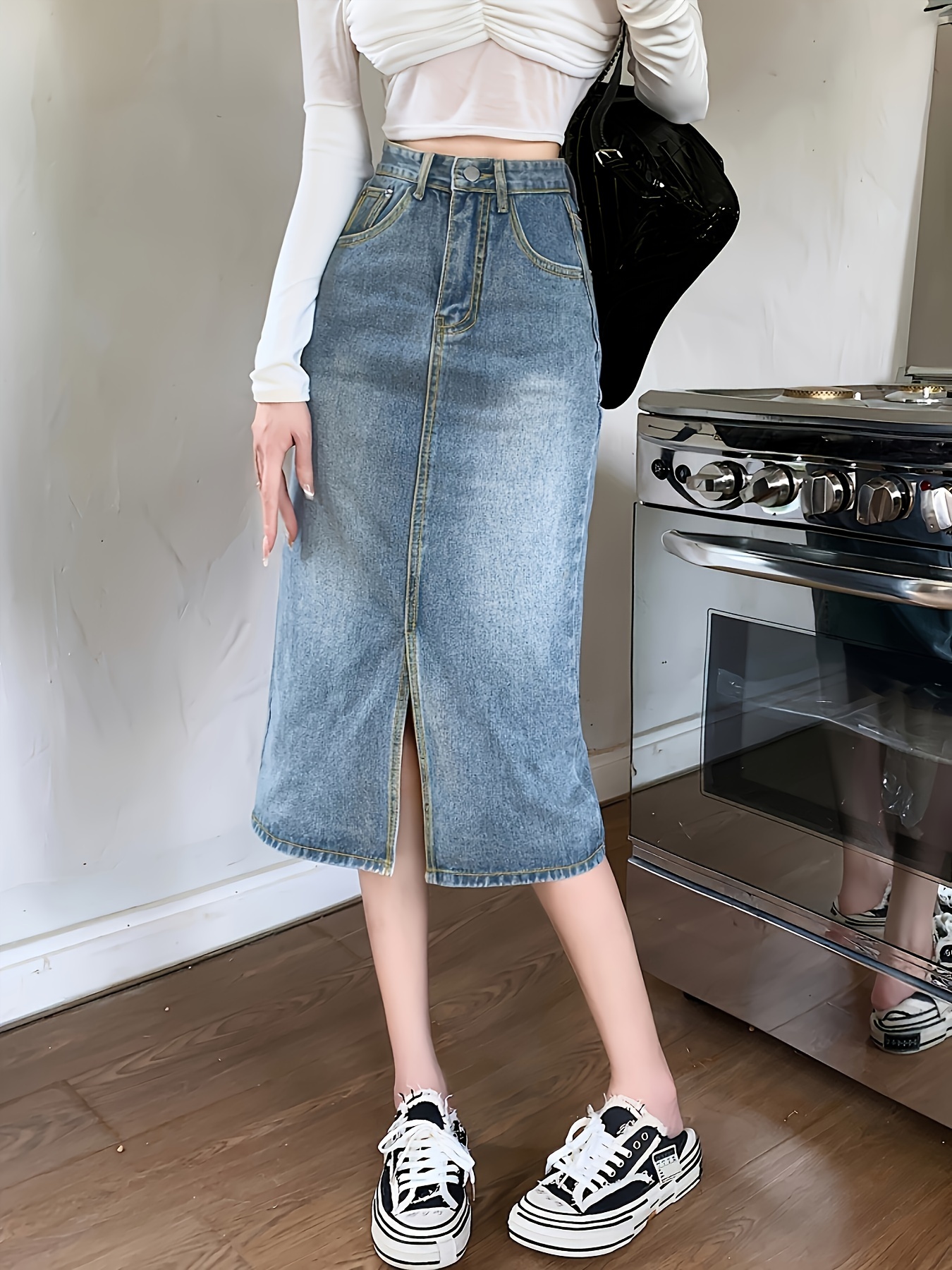 Split Front Vintage Style Denim Skirts, High Waist A-line Washed Denim Skirts, Women’s Denim Clothing