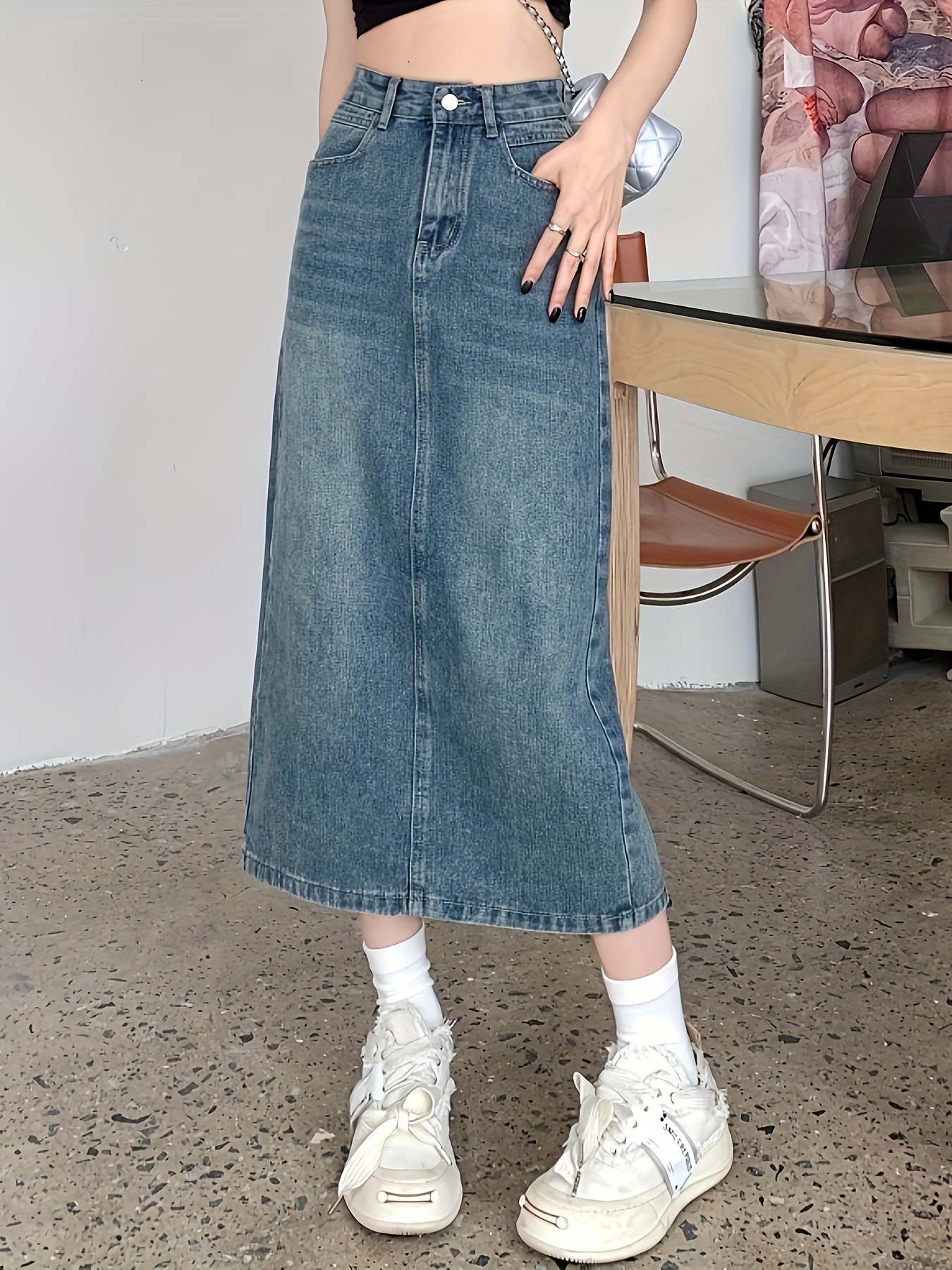 Stylish High-Waisted A-Line Denim Skirt – Women Denim Skirts – Vintage Inspired, Slim Fit, Front Split, Casual Midi Jean Skirt for Daily Wear