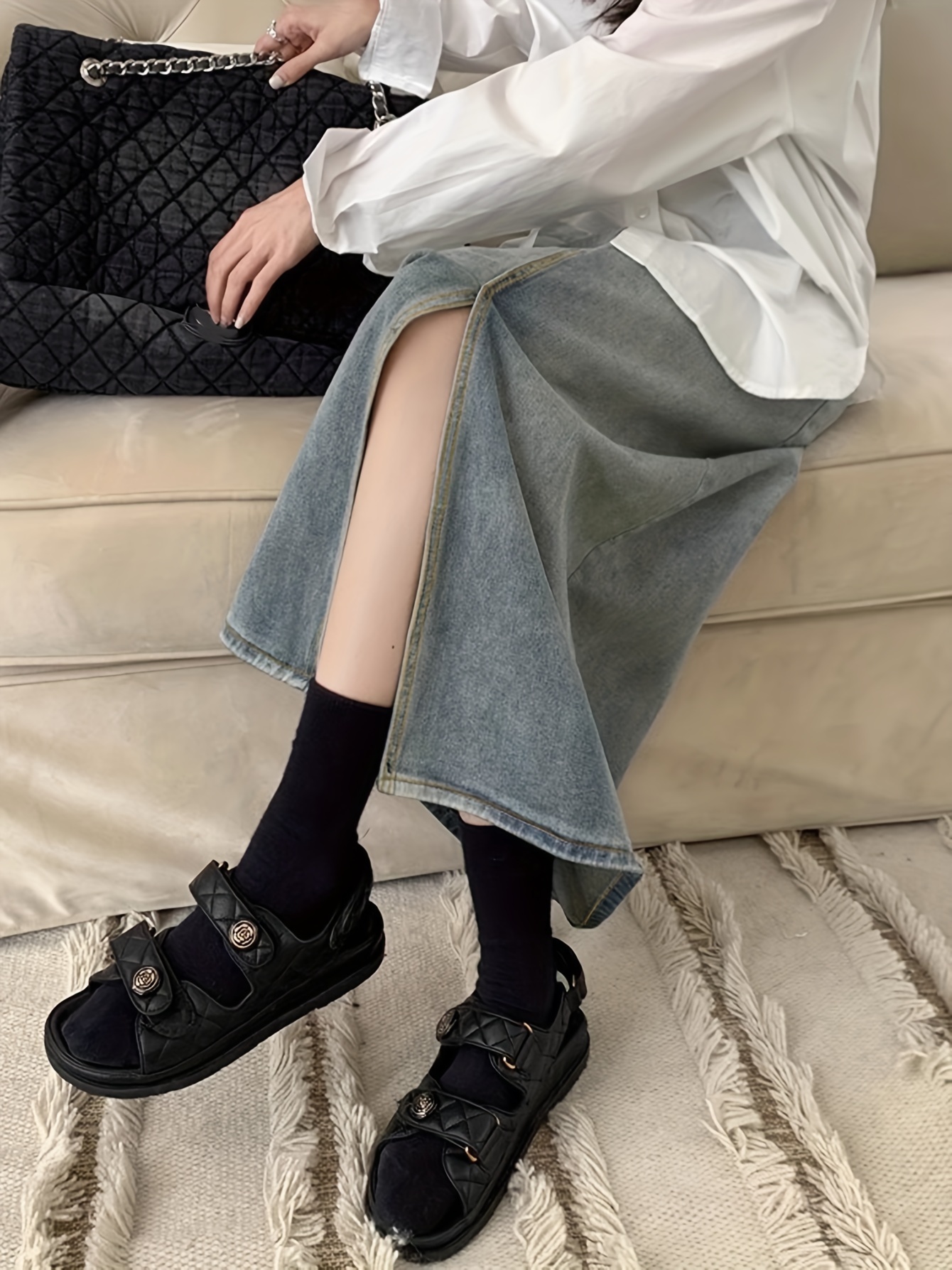 Stylish High Waist A-Line Denim Midi Skirt – Women’s Fashion Clothing – Elegant Non-Stretch Split Back Design, Comfortable Wear for Daily Life, Versatile and Chic