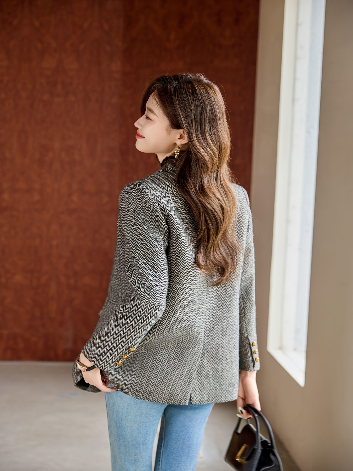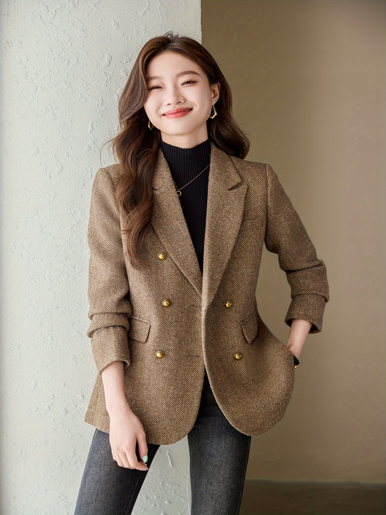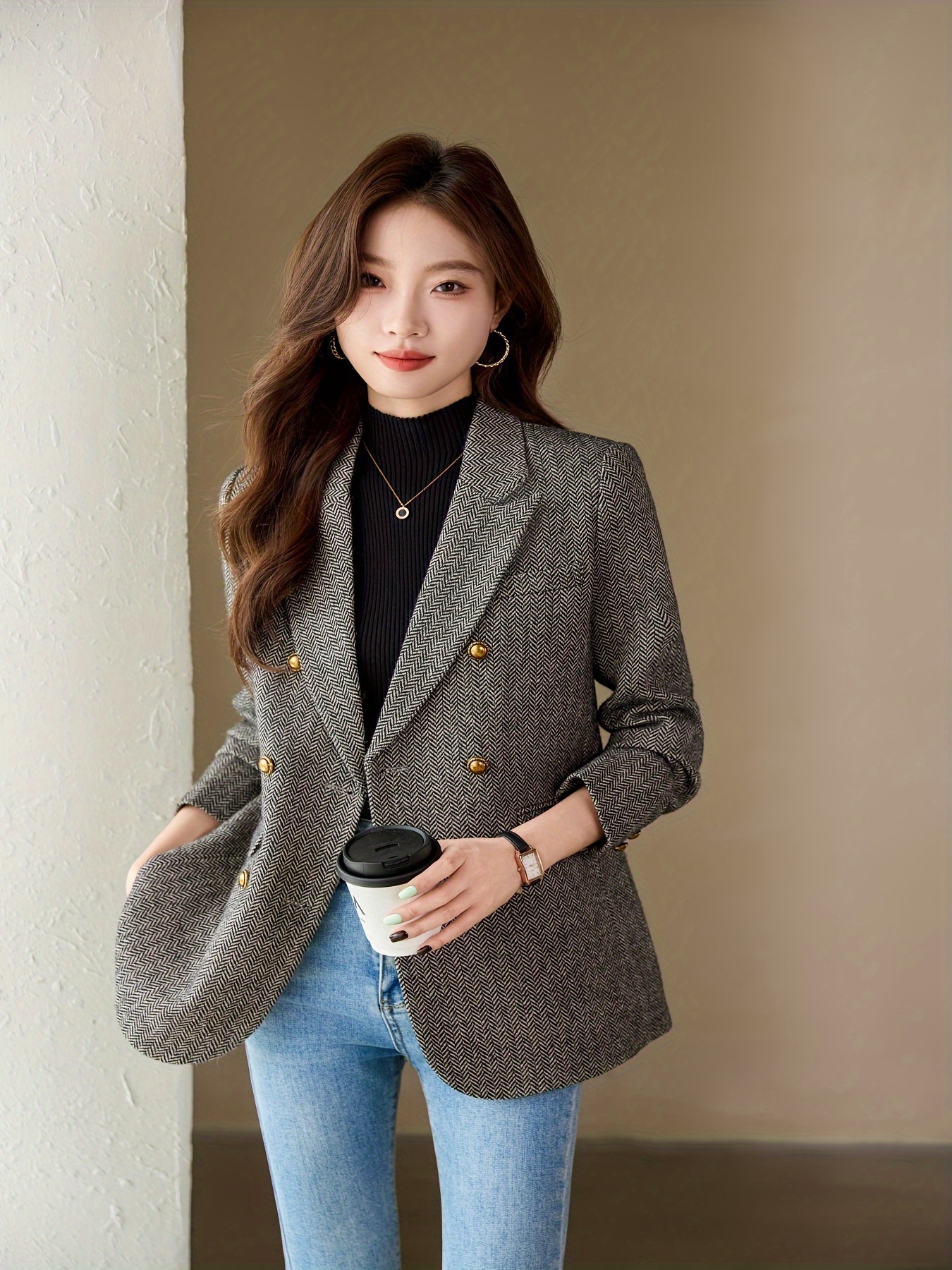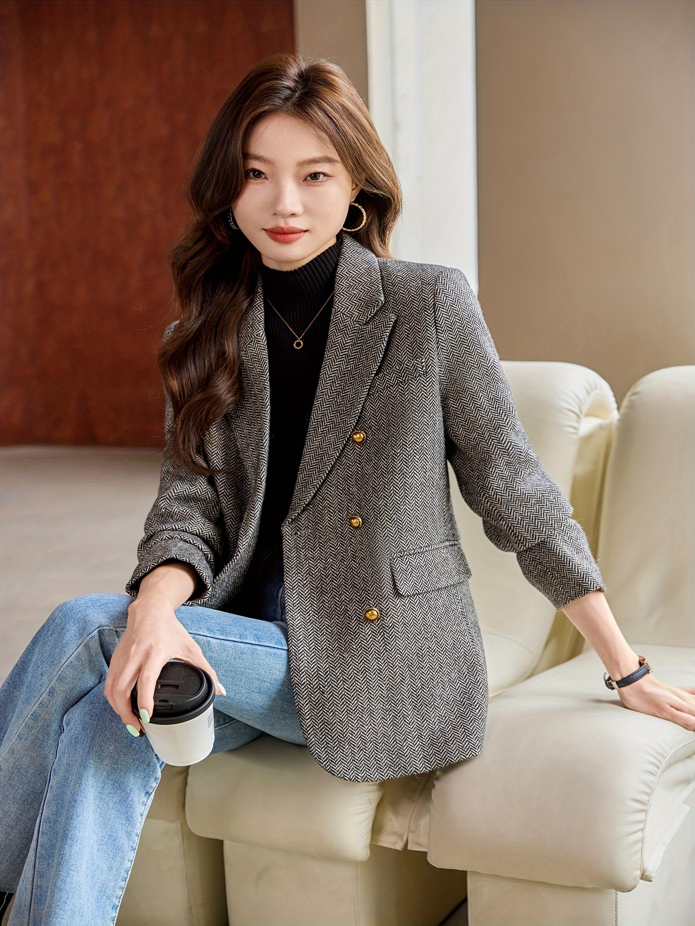 Button Front Loose Temperament Blazer, Elegant Lapel Long Sleeve Blazer For Office & Work, Women’s Clothing