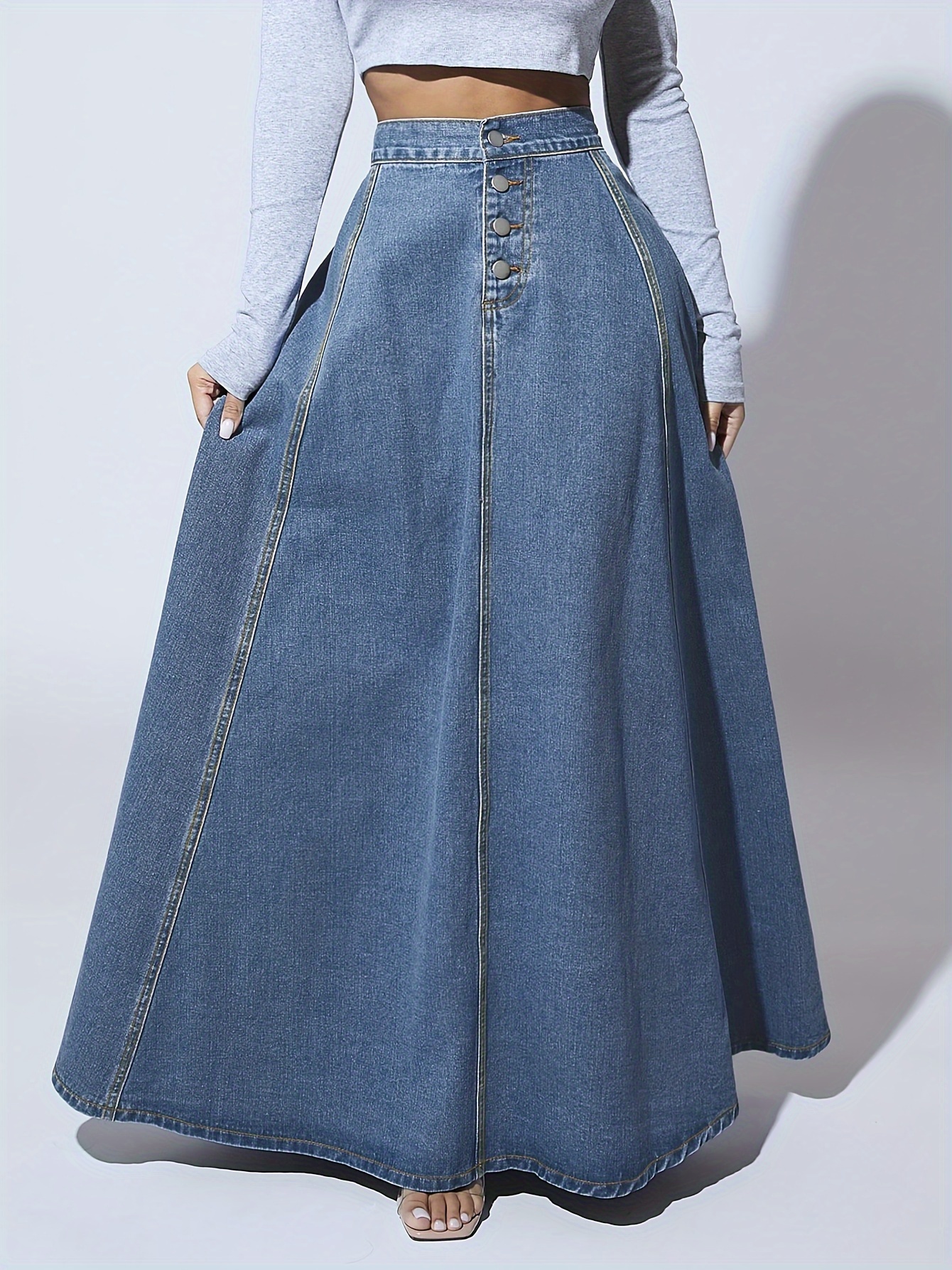 Fashionable Retro Flare Denim Skirt – Single-Breasted & High Rise – Timeless Maxi Silhouette in Washed Blue – Comfortable Inelastic Denim for Tall Womens Style