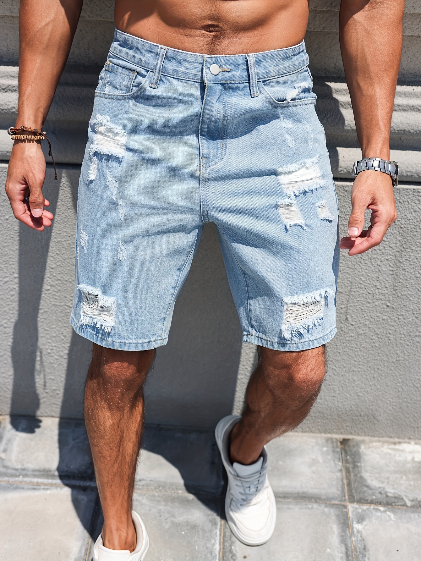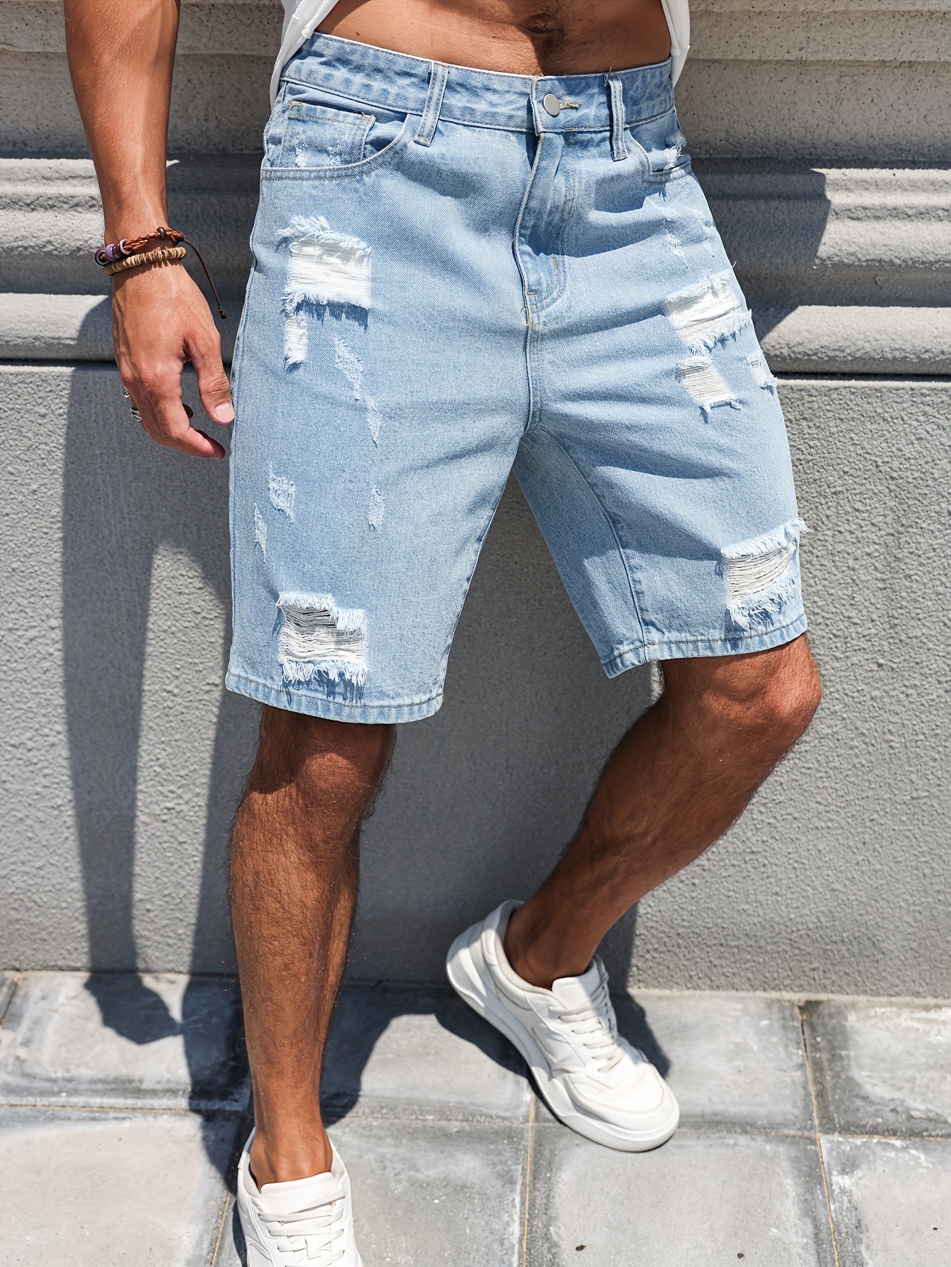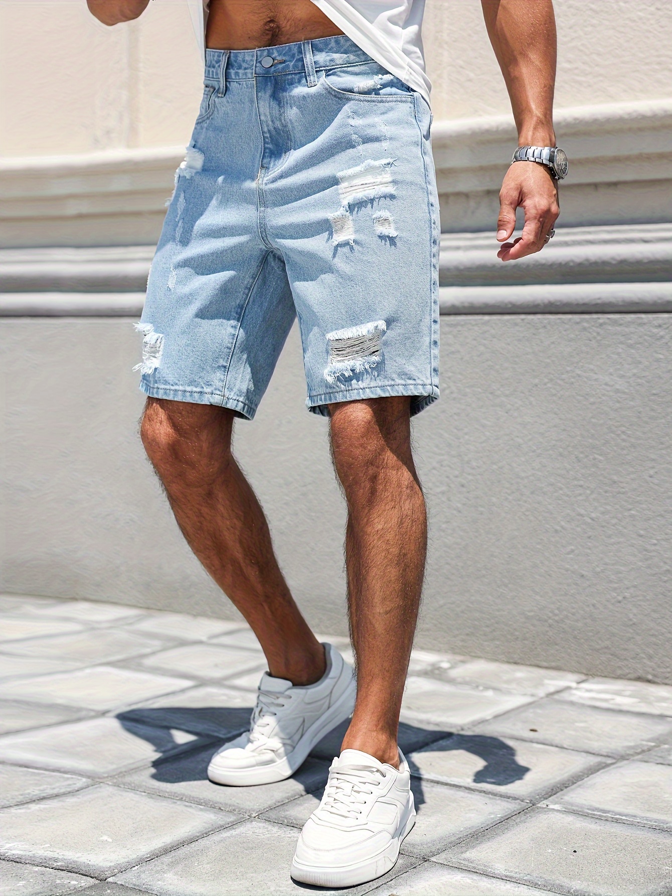 Men’s Distressed Denim Shorts – Casual Street Style, Knee-Length Ripped Jean Shorts with Pockets, Non-Stretch Rayon Blend, Machine Washable – Perfect for Summer & Outdoor Activities