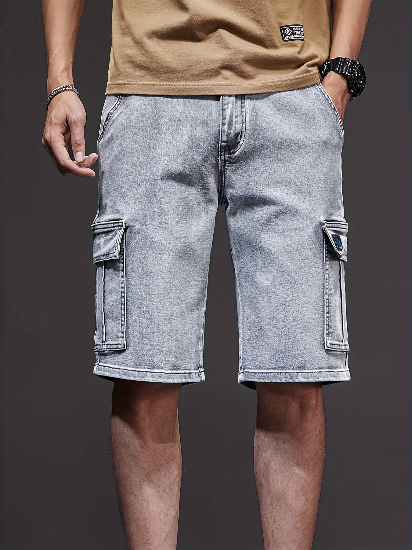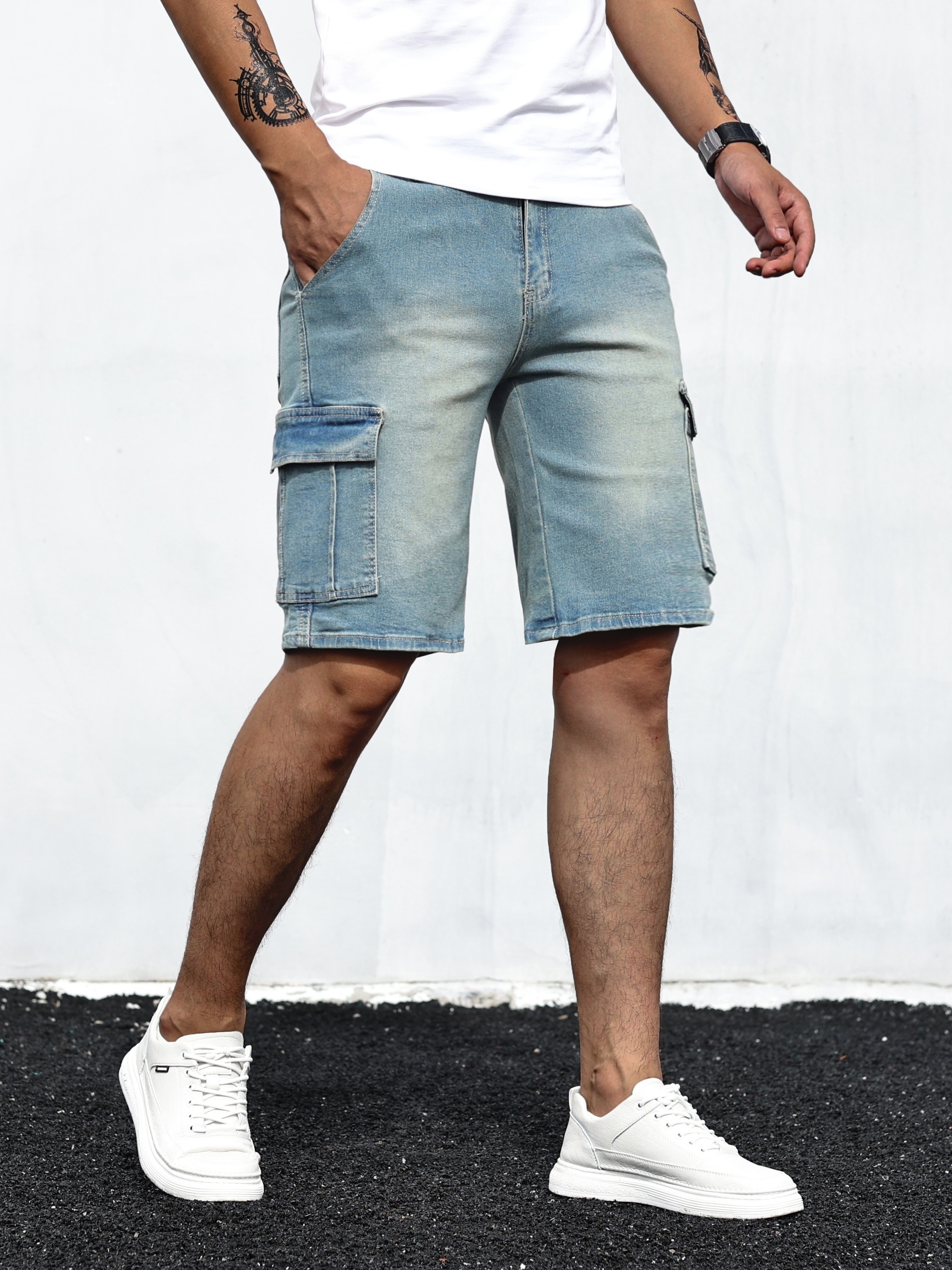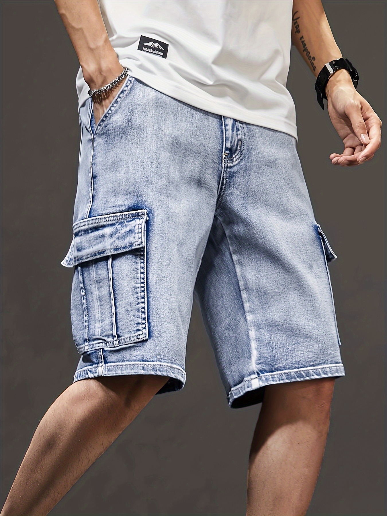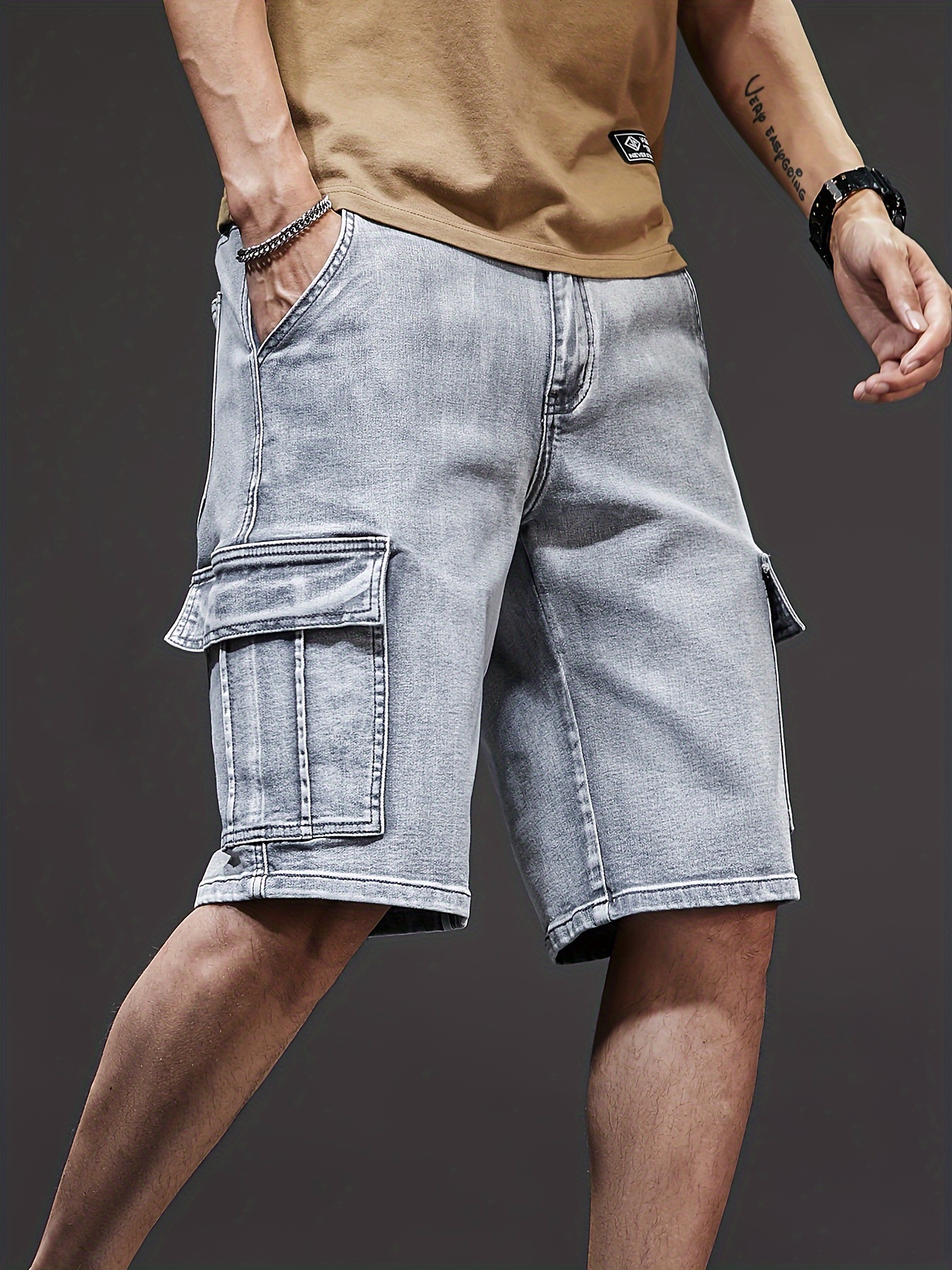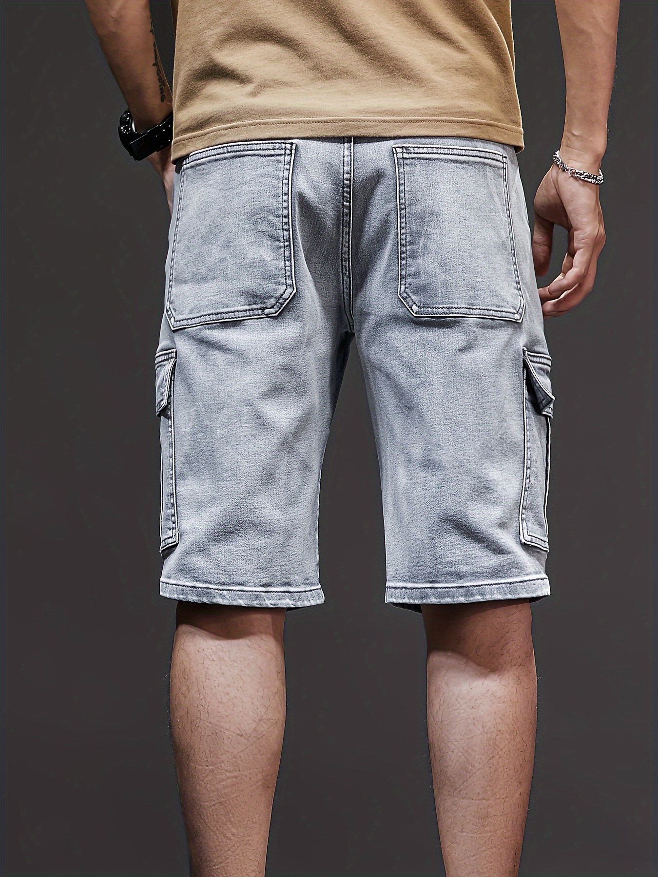 Men’s Solid Denim Shorts With Flap Pockets, Casual And Trendy Cargo Shorts For Summer Outdoors Wear