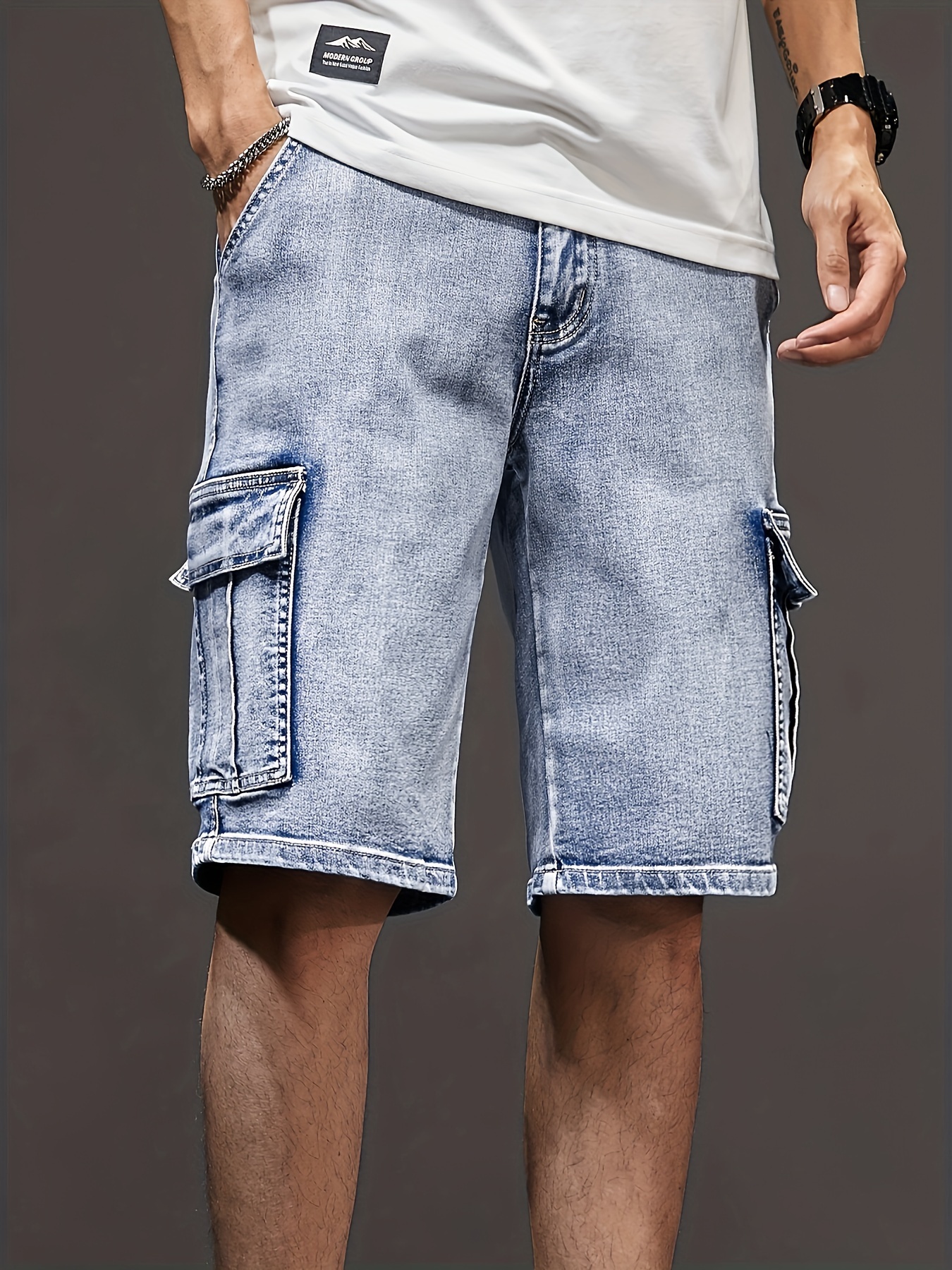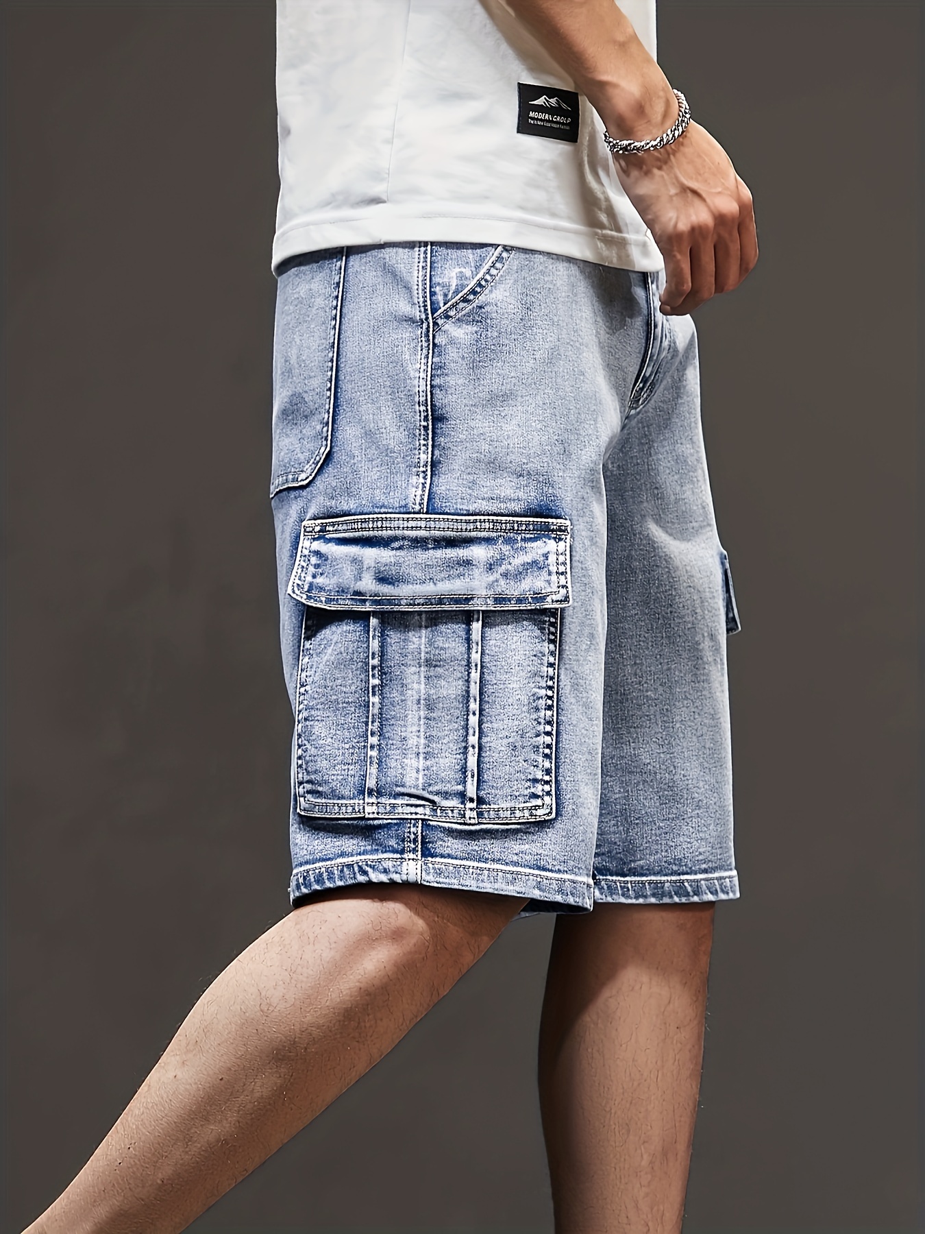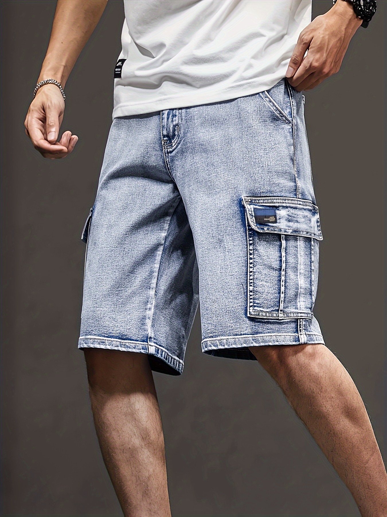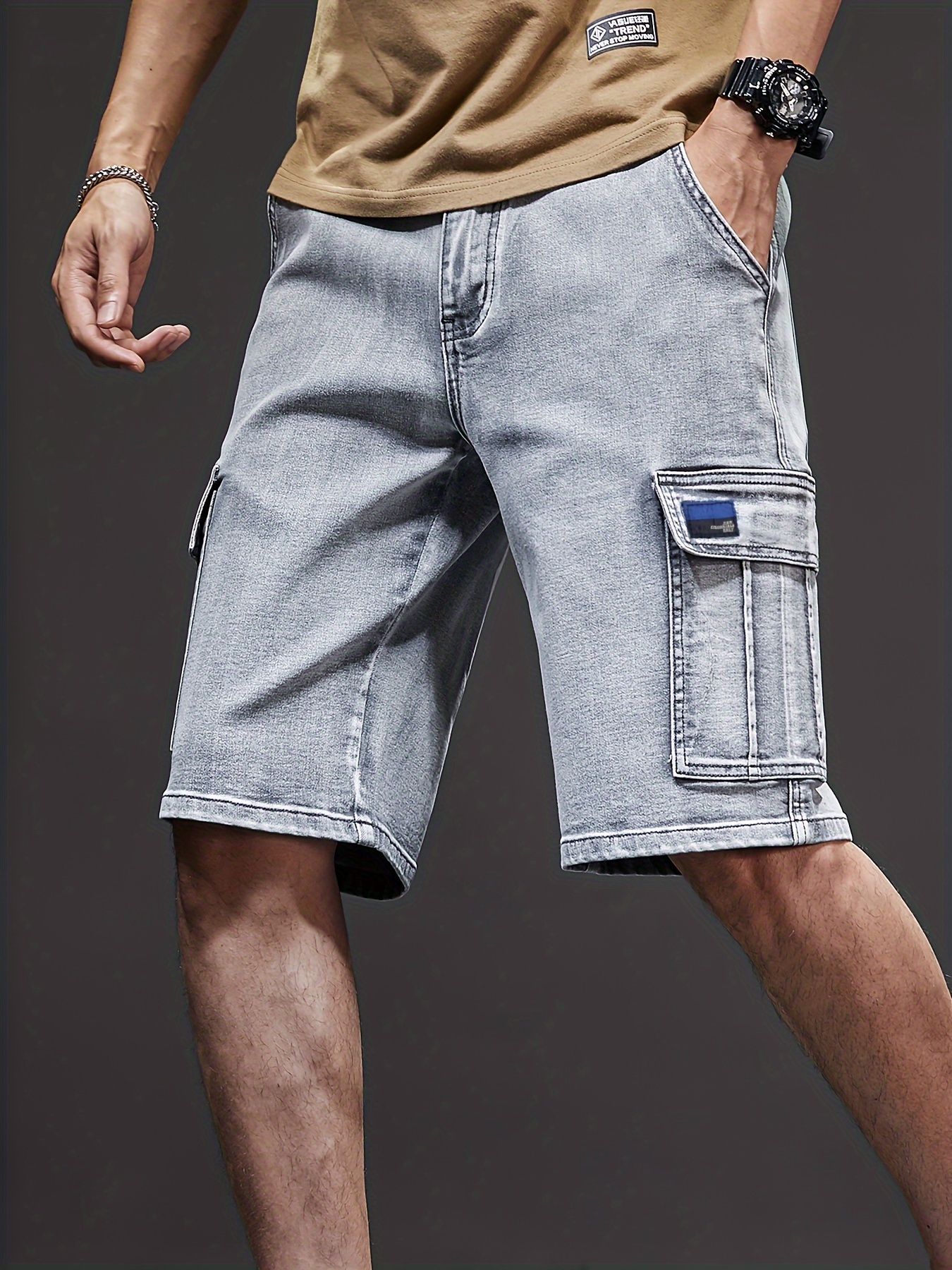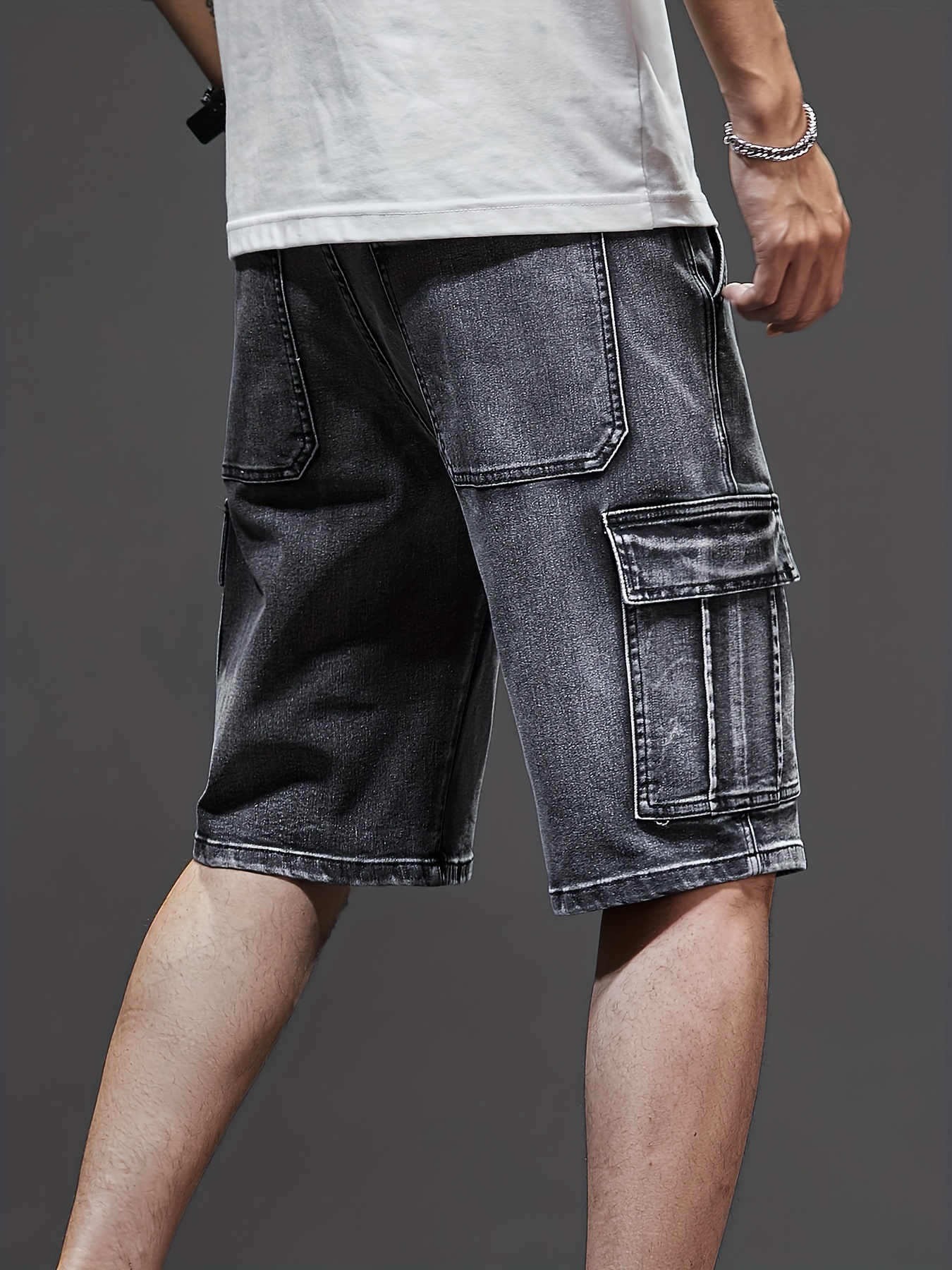 Men’s Solid Denim Shorts With Flap Pockets, Casual And Trendy Cargo Shorts For Summer Outdoors Wear