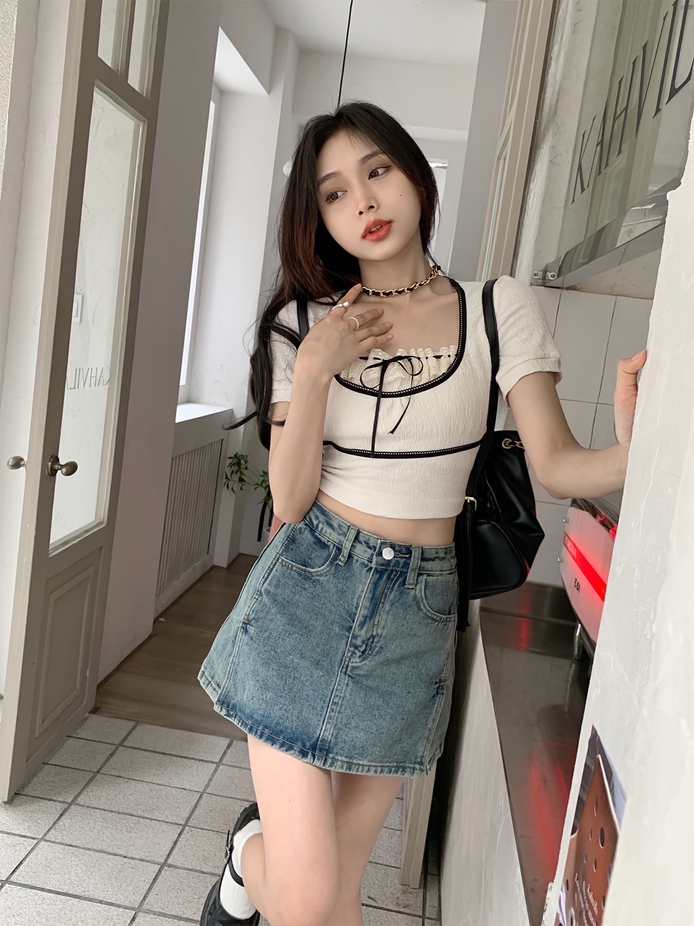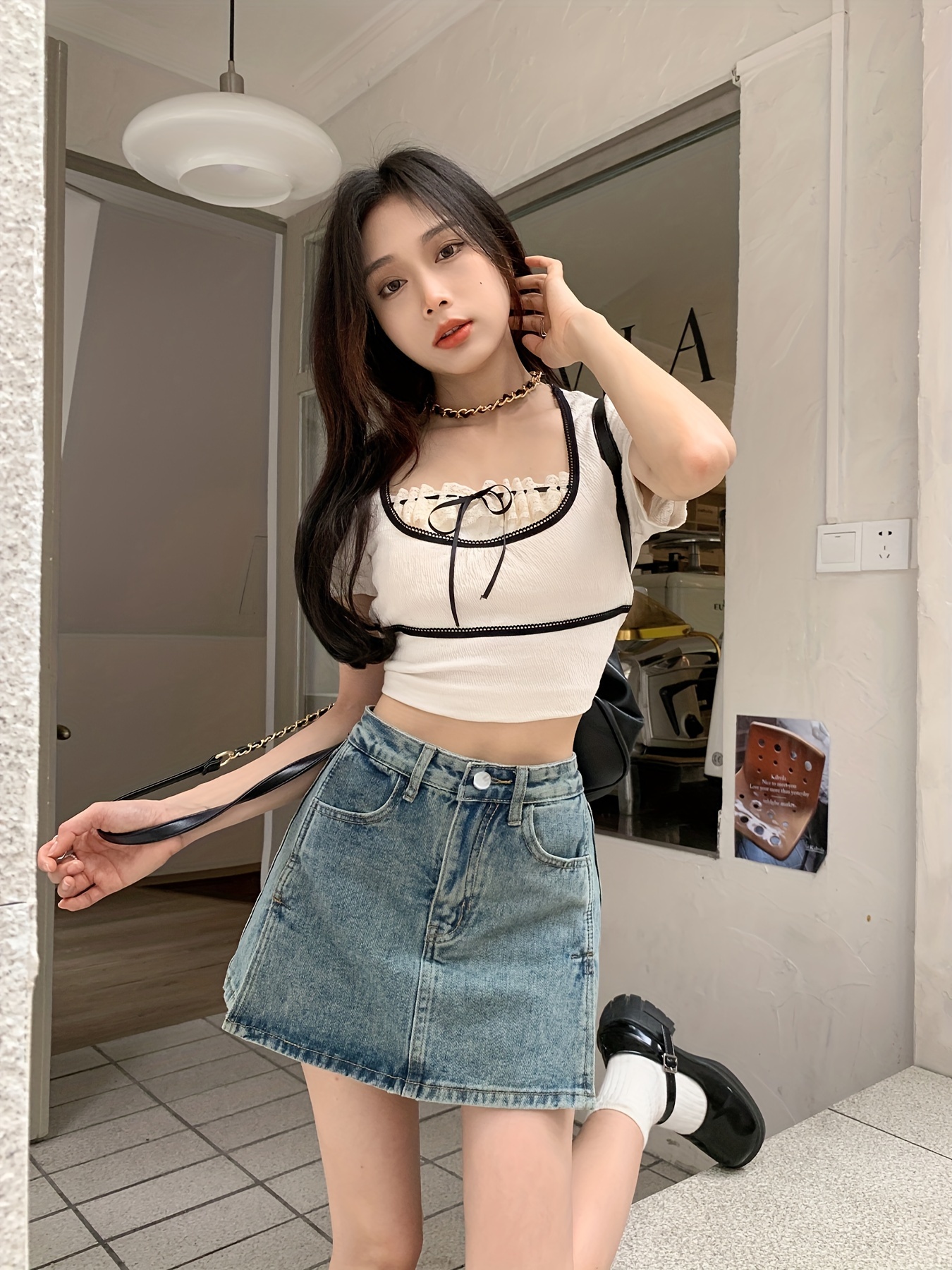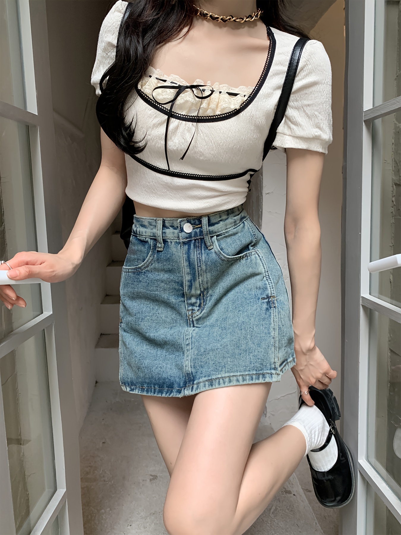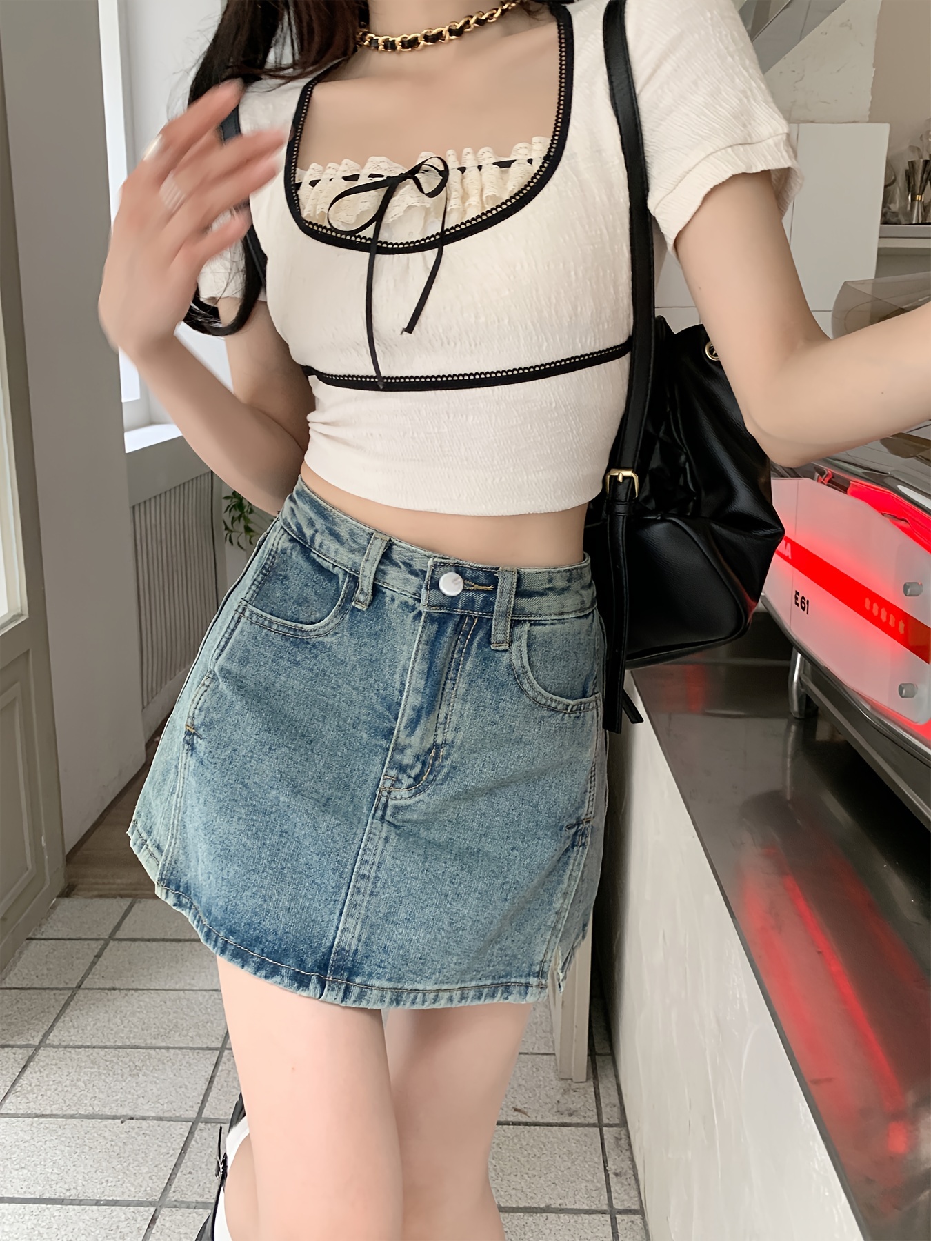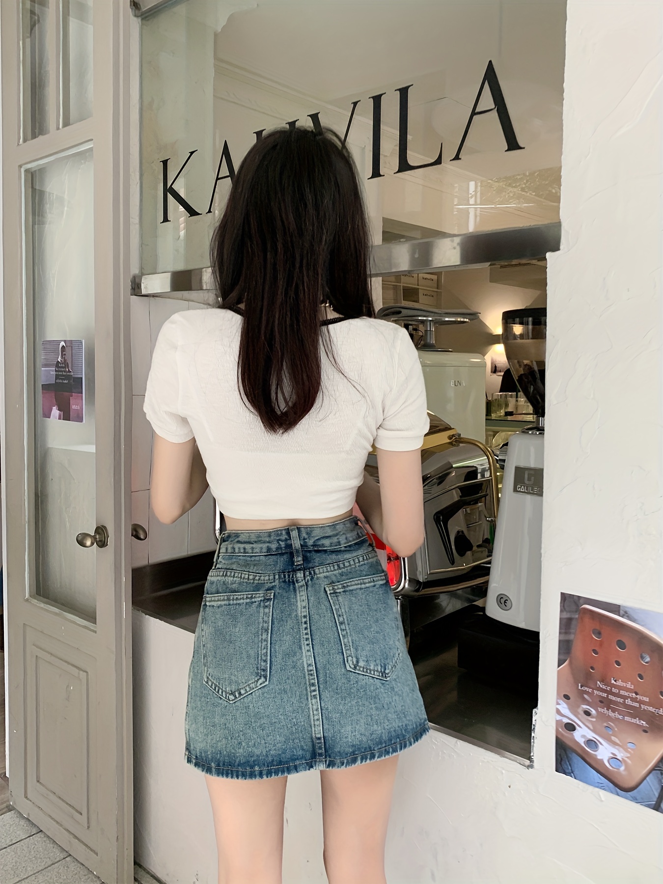 Plain Washed Blue High Rise Retro Style Zipper Button Closure Slash Pocket Mini Denim Skirt, Women’s Denim Jeans & Clothing is much better than others
