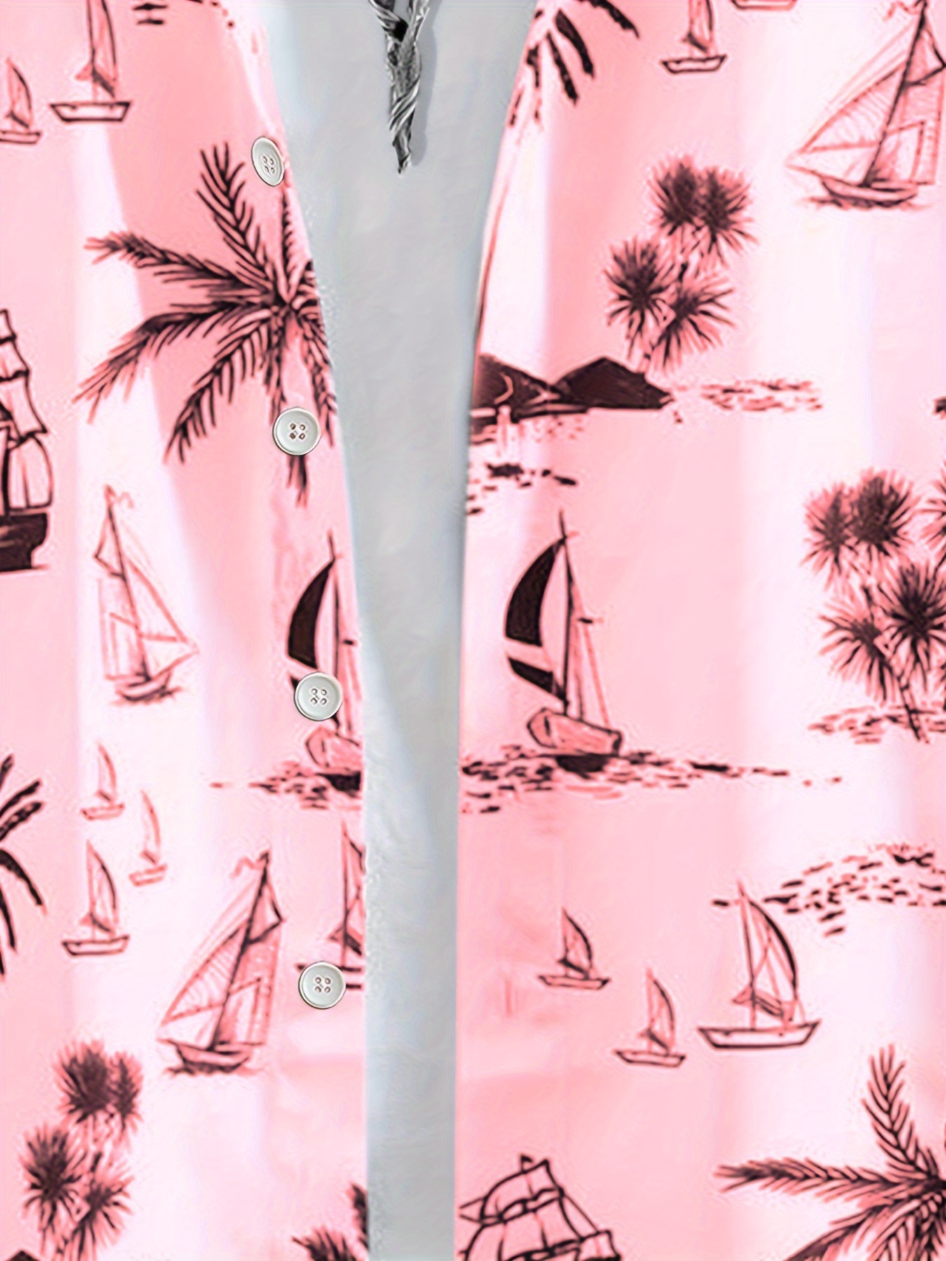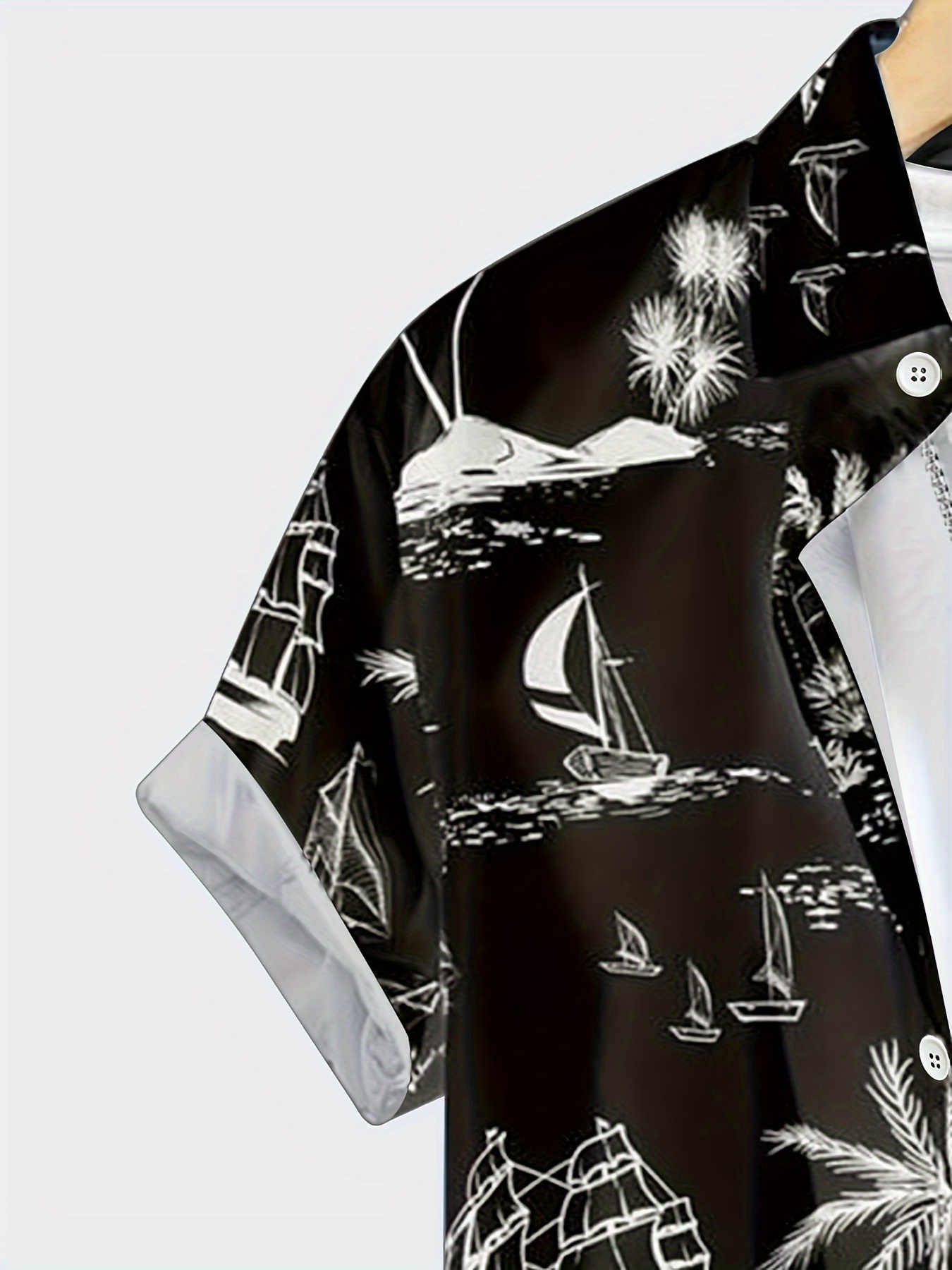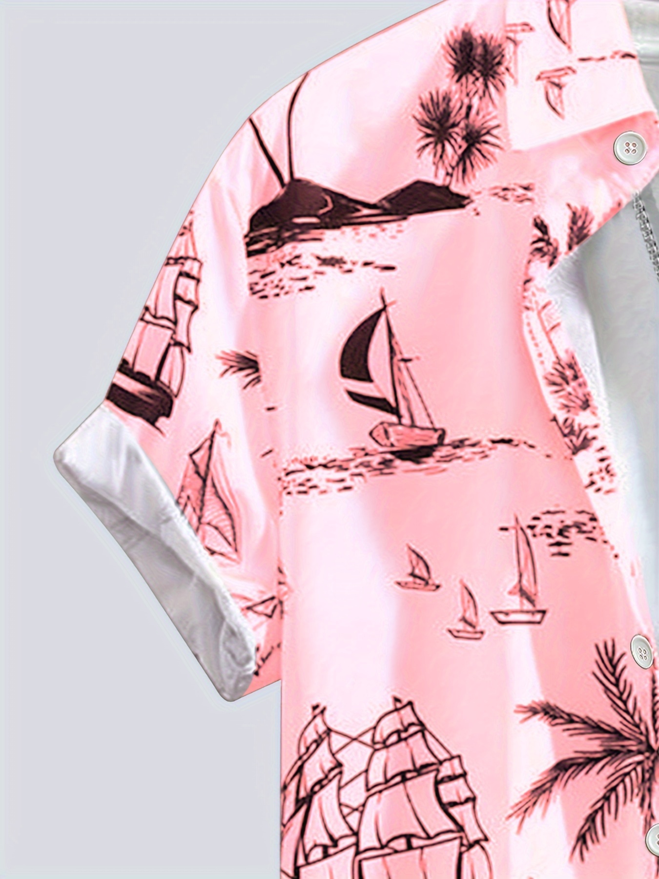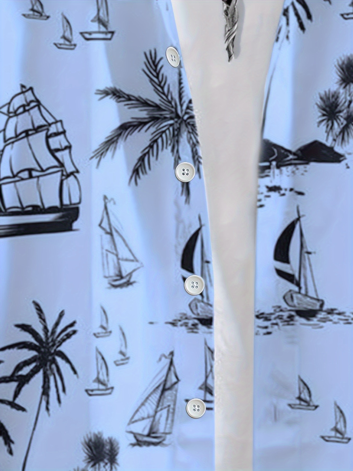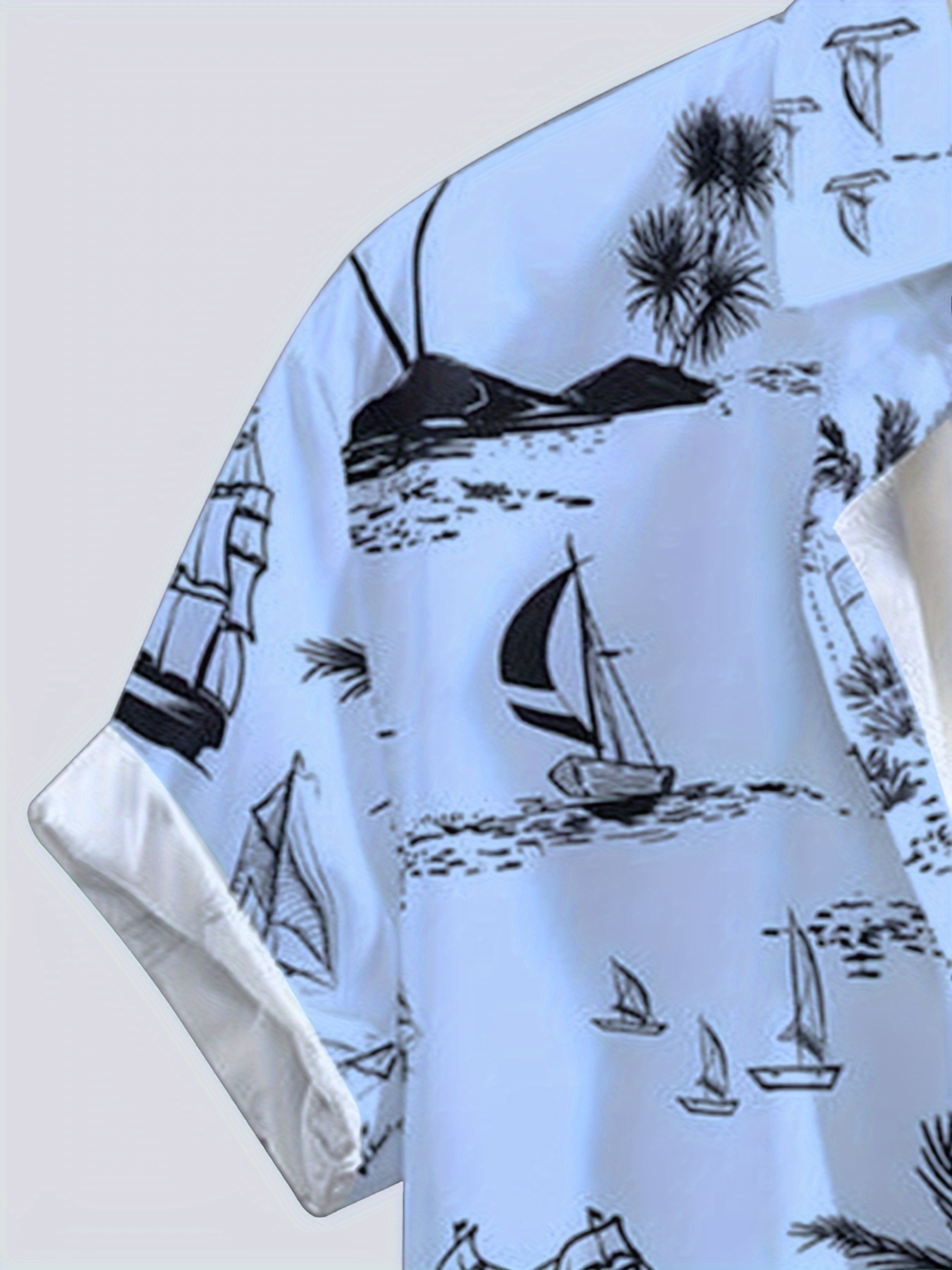 Plus Size Men’s Vibrant Boats Print Relaxed Fit Casual Shirt – Breathable Short Sleeve, Lapel Button Up, Soft Fabric, Perfect for Outdoor Activities, Summer Vacations, and Everyday Wear