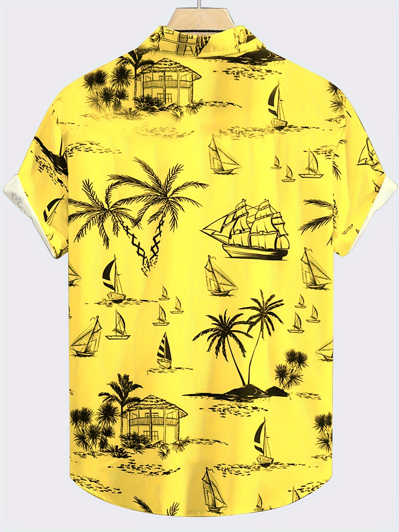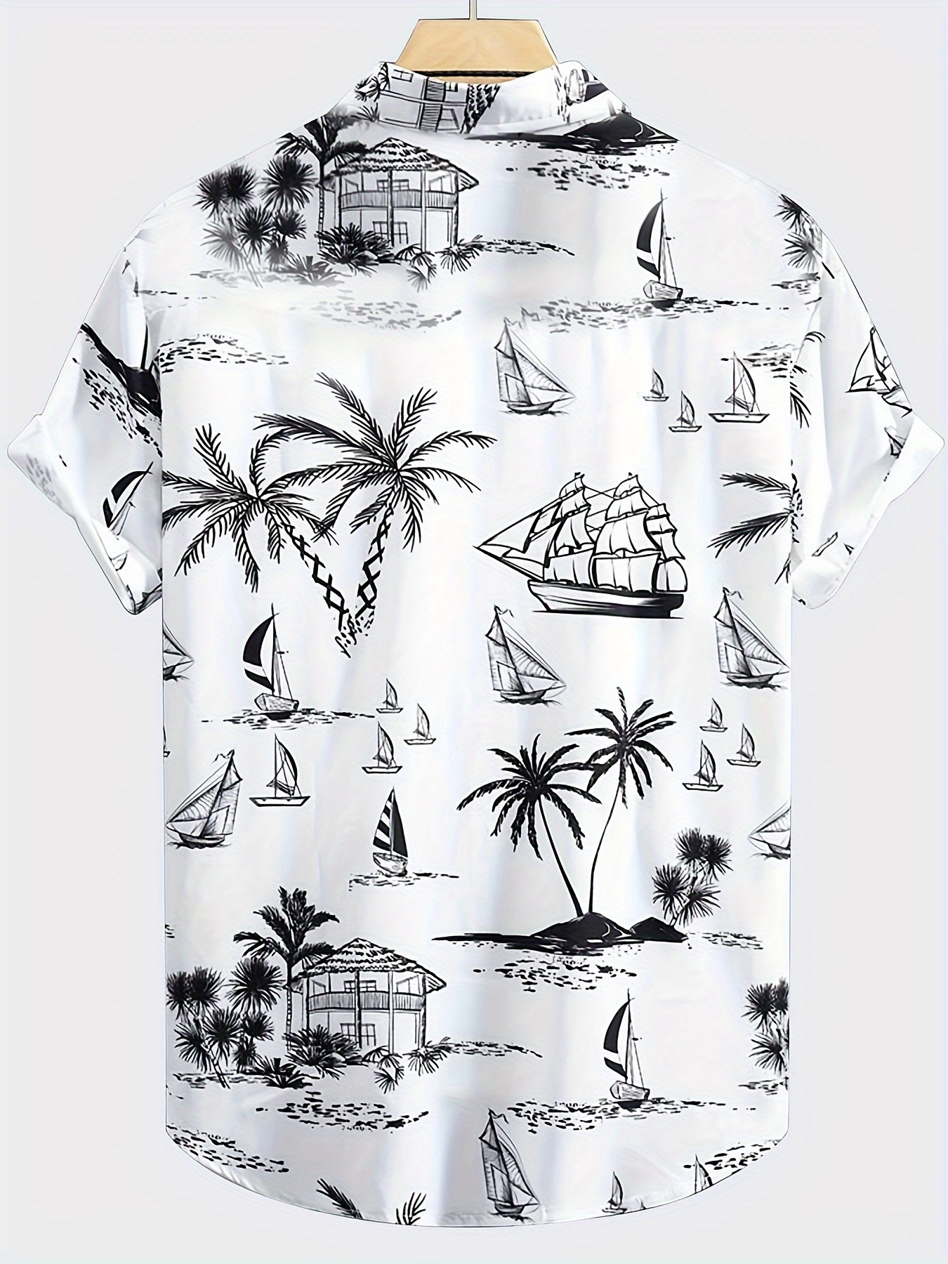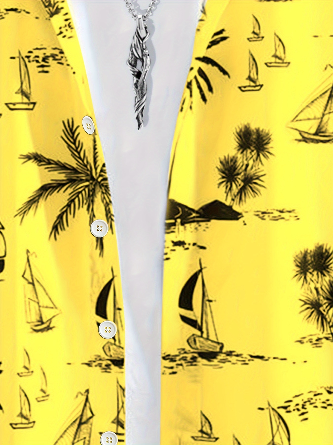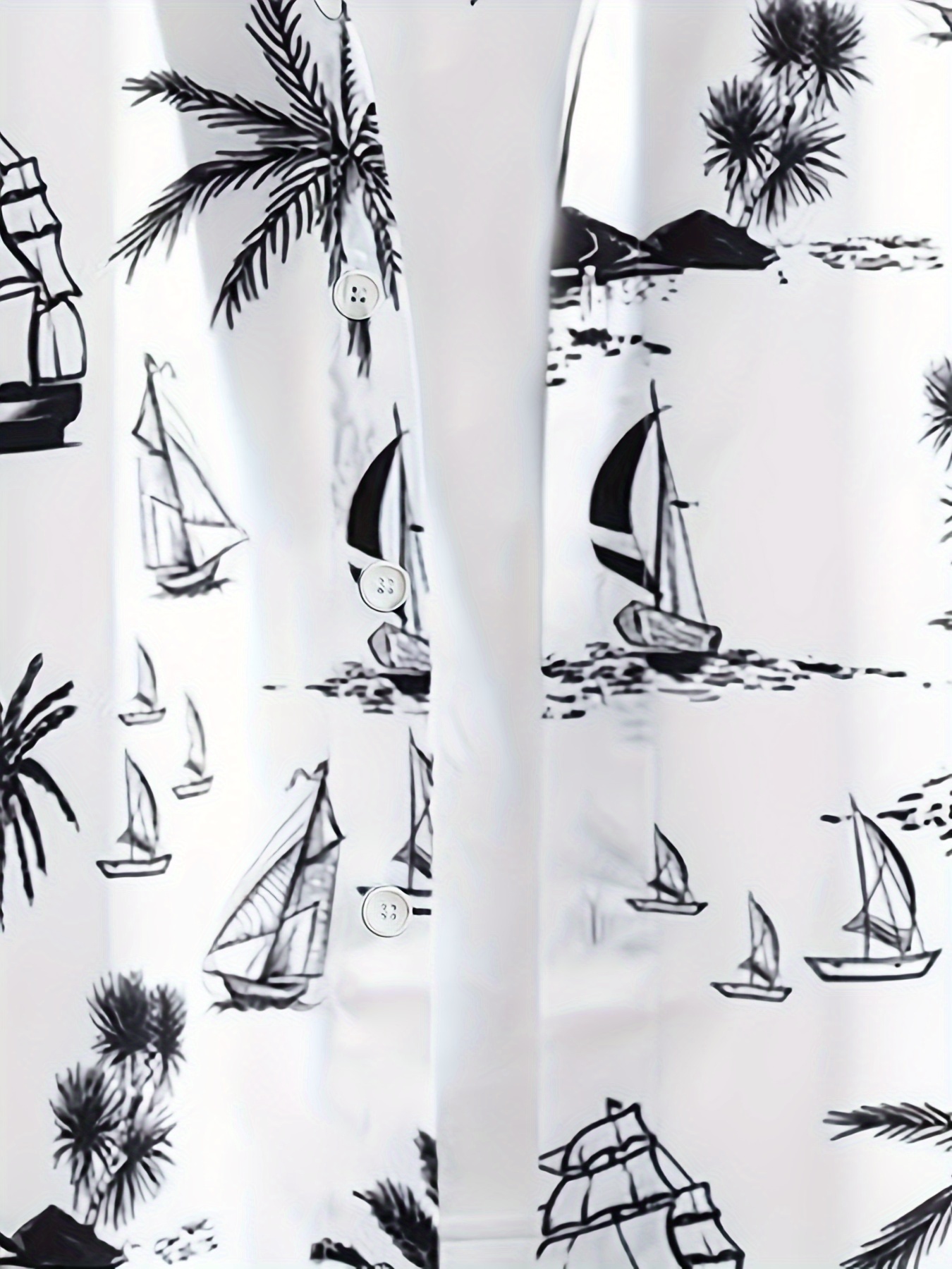 Plus Size Men’s Vibrant Boats Print Relaxed Fit Casual Shirt – Breathable Short Sleeve, Lapel Button Up, Soft Fabric, Perfect for Outdoor Activities, Summer Vacations, and Everyday Wear