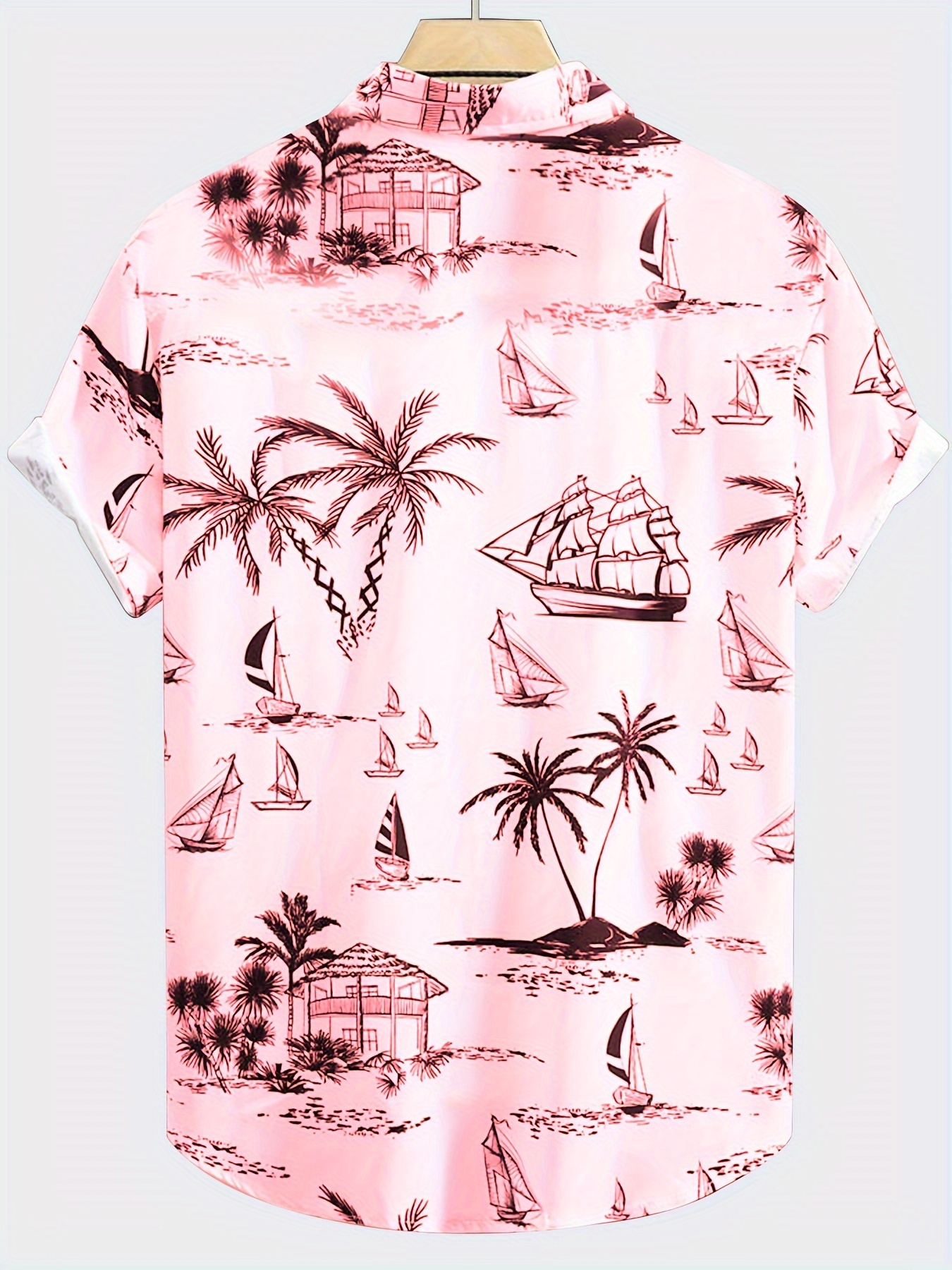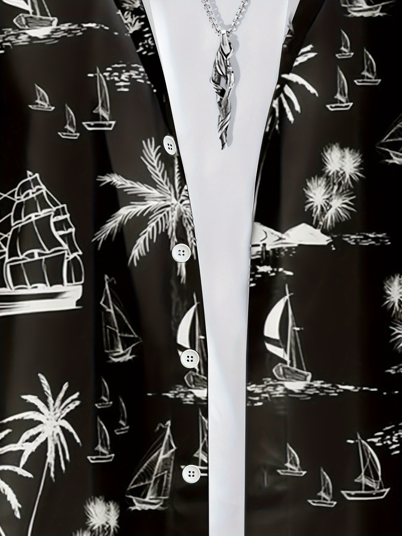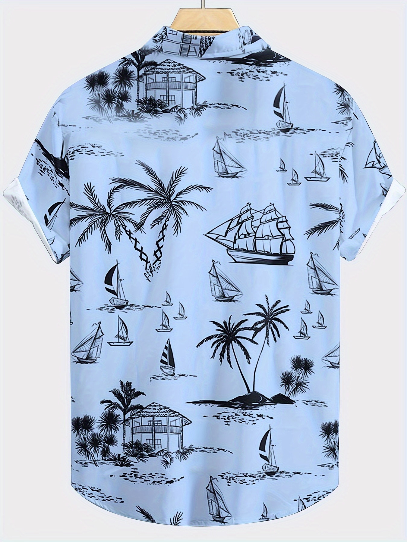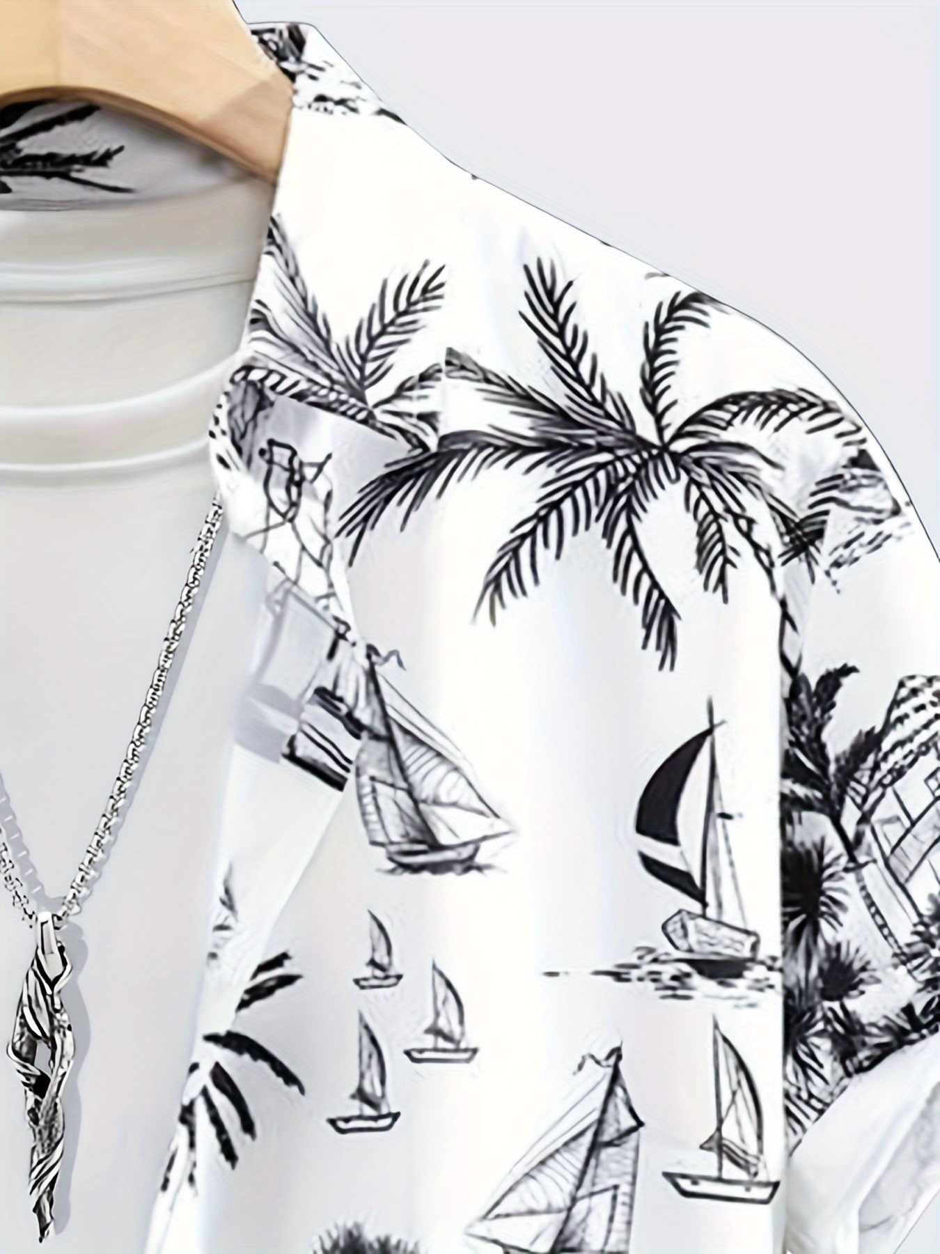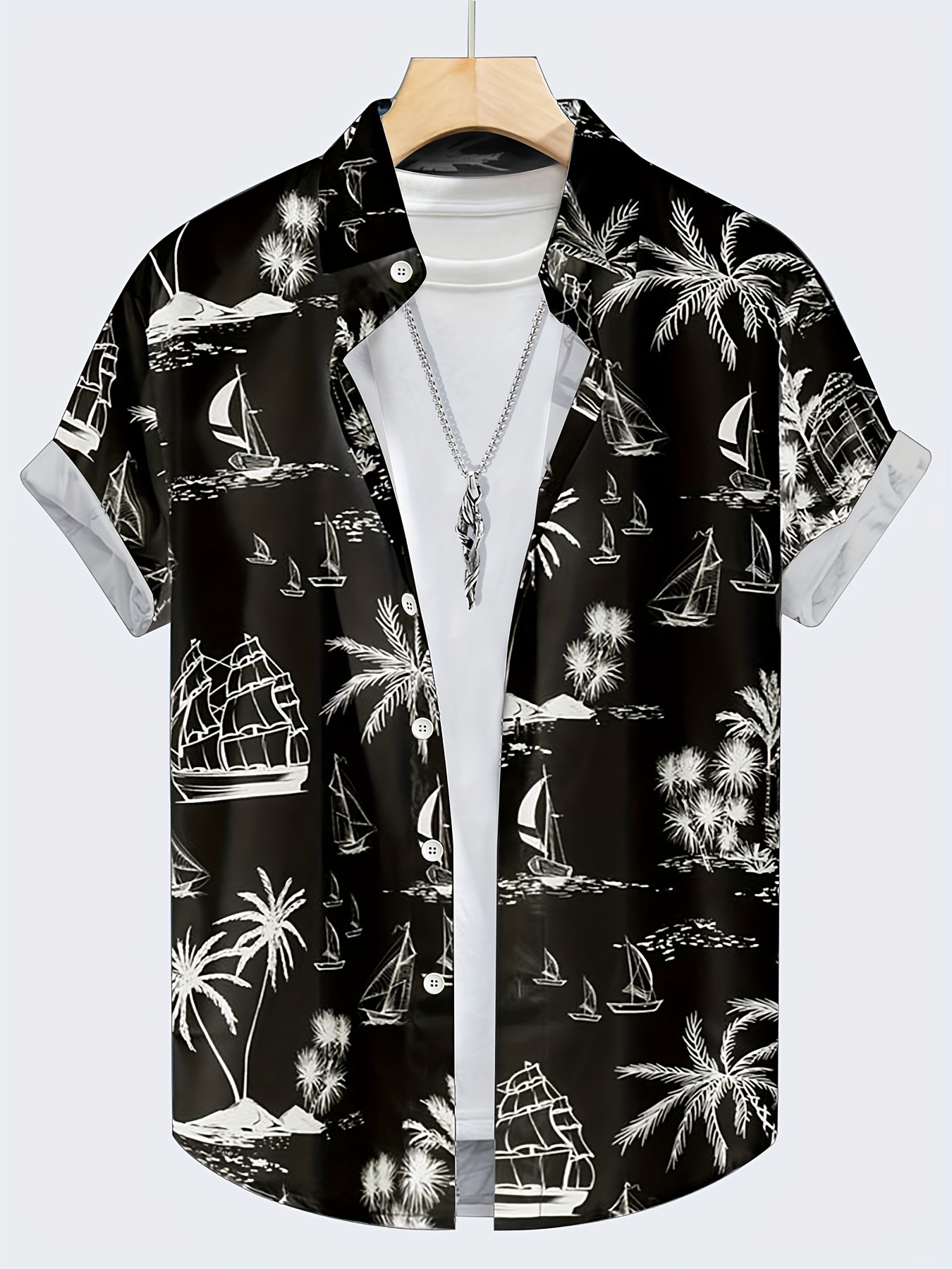 Plus Size Men’s Vibrant Boats Print Relaxed Fit Casual Shirt – Breathable Short Sleeve, Lapel Button Up, Soft Fabric, Perfect for Outdoor Activities, Summer Vacations, and Everyday Wear
