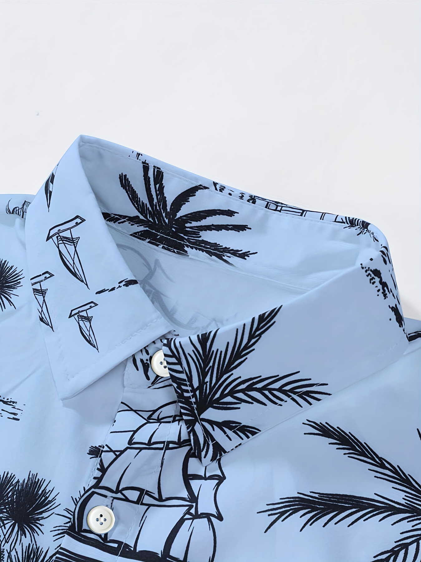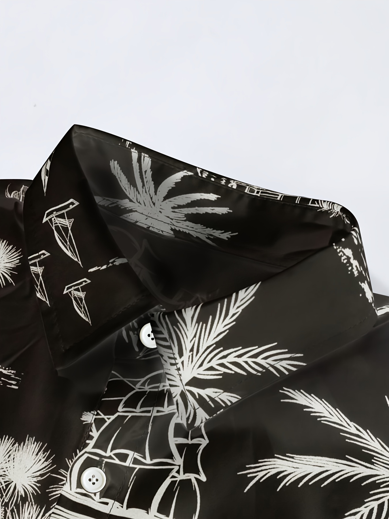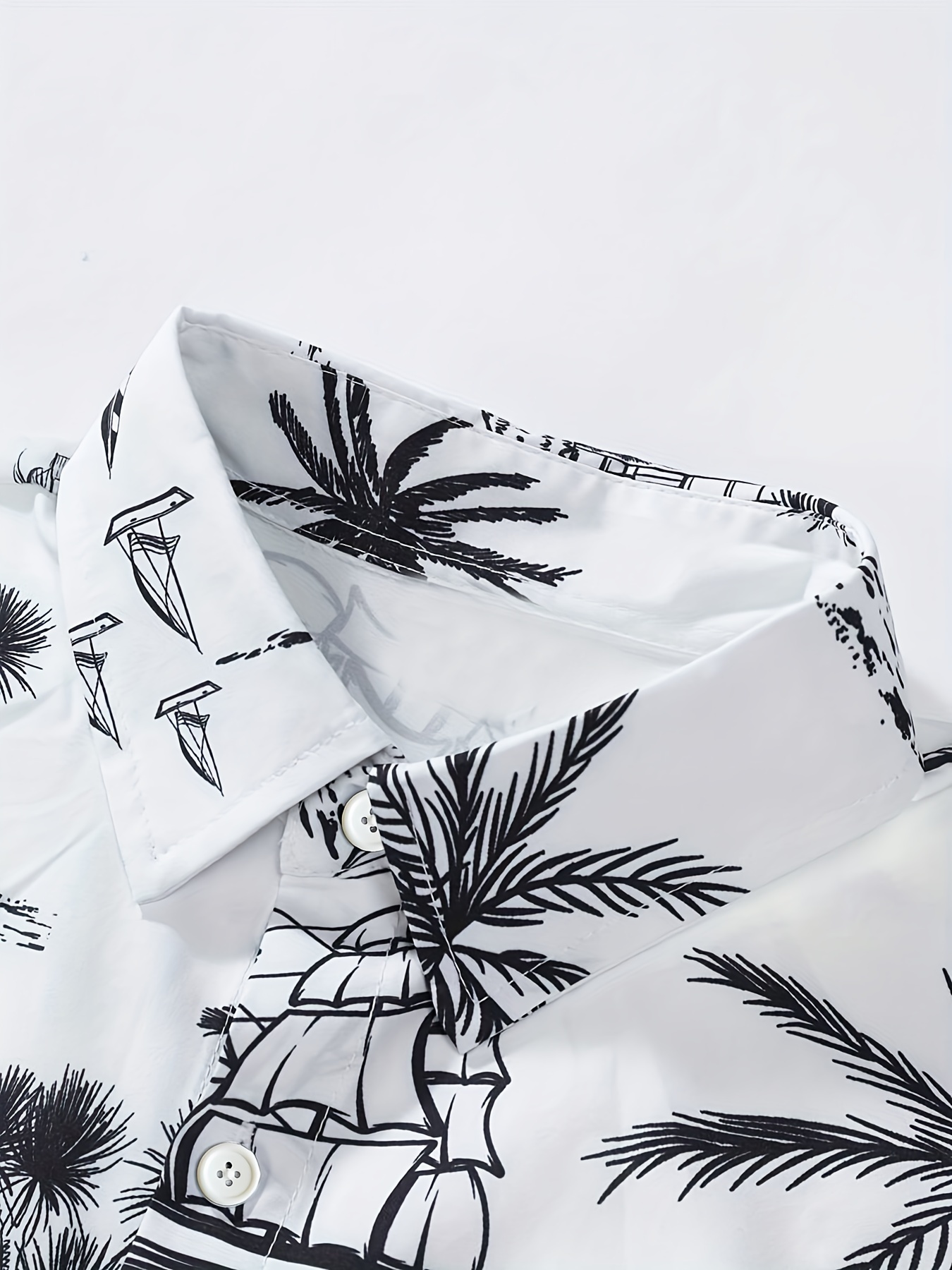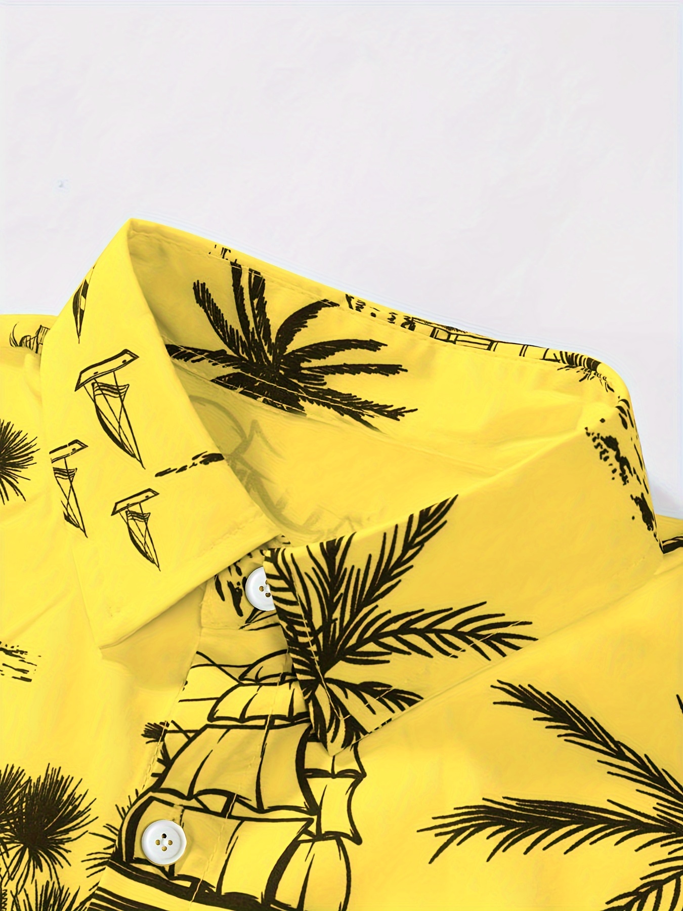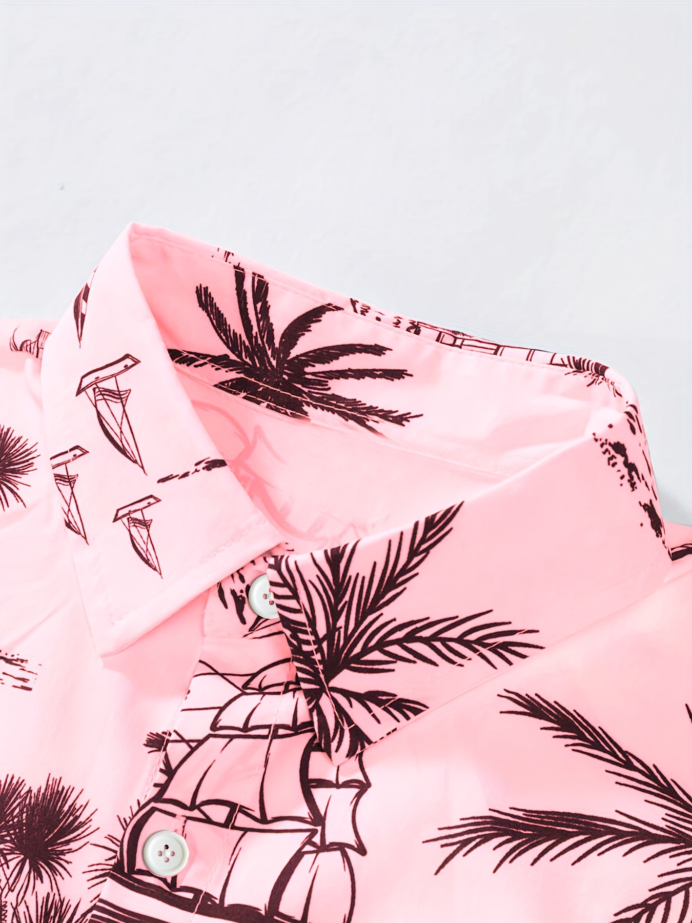 Plus Size Men’s Vibrant Boats Print Relaxed Fit Casual Shirt – Breathable Short Sleeve, Lapel Button Up, Soft Fabric, Perfect for Outdoor Activities, Summer Vacations, and Everyday Wear