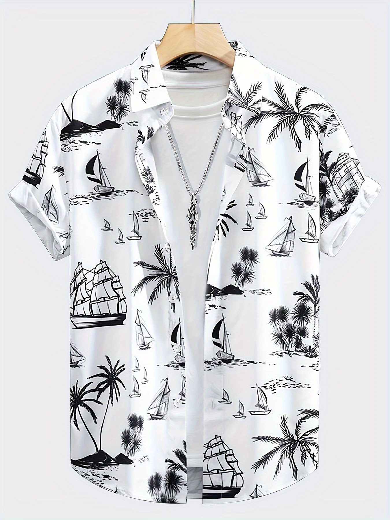 Plus Size Men’s Vibrant Boats Print Relaxed Fit Casual Shirt – Breathable Short Sleeve, Lapel Button Up, Soft Fabric, Perfect for Outdoor Activities, Summer Vacations, and Everyday Wear